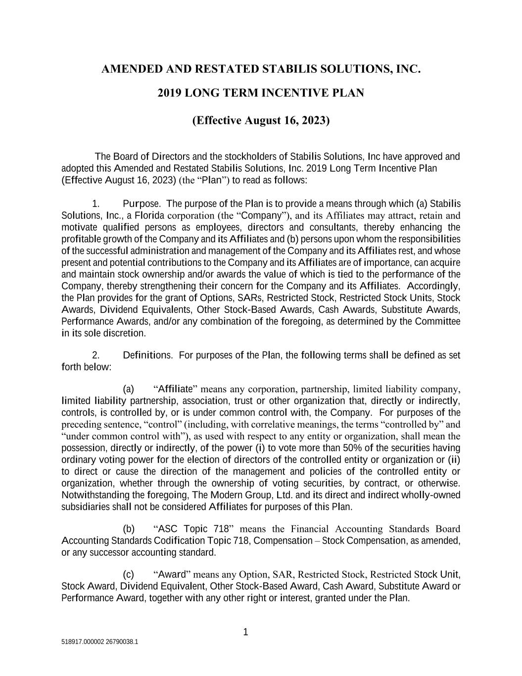 1 518917.000002 26790038.1 AMENDED AND RESTATED STABILIS SOLUTIONS, INC. 2019 LONG TERM INCENTIVE PLAN (Effective August 16, 2023) The Board of Directors and the stockholders of Stabilis Solutions, Inc have approved and adopted this Amended and Restated Stabilis Solutions, Inc. 2019 Long Term Incentive Plan (Effective August 16, 2023) (the “Plan”) to read as follows: 1. Purpose. The purpose of the Plan is to provide a means through which (a) Stabilis Solutions, Inc., a Florida corporation (the “Company”), and its Affiliates may attract, retain and motivate qualified persons as employees, directors and consultants, thereby enhancing the profitable growth of the Company and its Affiliates and (b) persons upon whom the responsibilities of the successful administration and management of the Company and its Affiliates rest, and whose present and potential contributions to the Company and its Affiliates are of importance, can acquire and maintain stock ownership and/or awards the value of which is tied to the performance of the Company, thereby strengthening their concern for the Company and its Affiliates. Accordingly, the Plan provides for the grant of Options, SARs, Restricted Stock, Restricted Stock Units, Stock Awards, Dividend Equivalents, Other Stock-Based Awards, Cash Awards, Substitute Awards, Performance Awards, and/or any combination of the foregoing, as determined by the Committee in its sole discretion. 2. Definitions. For purposes of the Plan, the following terms shall be defined as set forth below: (a) “Affiliate” means any corporation, partnership, limited liability company, limited liability partnership, association, trust or other organization that, directly or indirectly, controls, is controlled by, or is under common control with, the Company. For purposes of the preceding sentence, “control” (including, with correlative meanings, the terms “controlled by” and “under common control with”), as used with respect to any entity or organization, shall mean the possession, directly or indirectly, of the power (i) to vote more than 50% of the securities having ordinary voting power for the election of directors of the controlled entity or organization or (ii) to direct or cause the direction of the management and policies of the controlled entity or organization, whether through the ownership of voting securities, by contract, or otherwise. Notwithstanding the foregoing, The Modern Group, Ltd. and its direct and indirect wholly-owned subsidiaries shall not be considered Affiliates for purposes of this Plan. (b) “ASC Topic 718” means the Financial Accounting Standards Board Accounting Standards Codification Topic 718, Compensation – Stock Compensation, as amended, or any successor accounting standard. (c) “Award” means any Option, SAR, Restricted Stock, Restricted Stock Unit, Stock Award, Dividend Equivalent, Other Stock-Based Award, Cash Award, Substitute Award or Performance Award, together with any other right or interest, granted under the Plan.