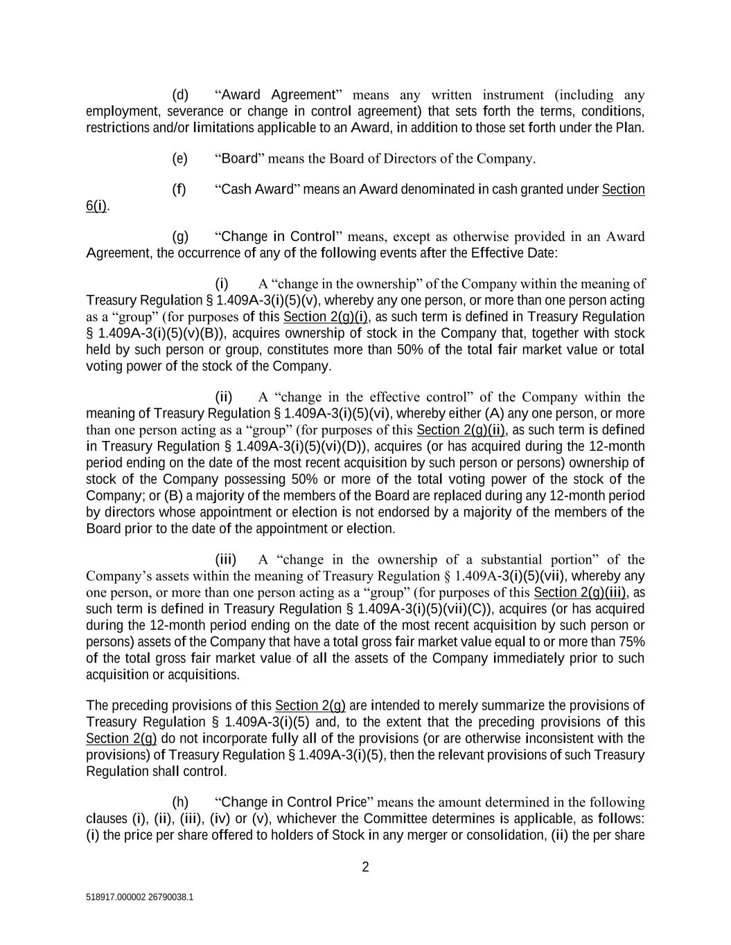 2 518917.000002 26790038.1 (d) “Award Agreement” means any written instrument (including any employment, severance or change in control agreement) that sets forth the terms, conditions, restrictions and/or limitations applicable to an Award, in addition to those set forth under the Plan. (e) “Board” means the Board of Directors of the Company. (f) “Cash Award” means an Award denominated in cash granted under Section 6(i). (g) “Change in Control” means, except as otherwise provided in an Award Agreement, the occurrence of any of the following events after the Effective Date: (i) A “change in the ownership” of the Company within the meaning of Treasury Regulation § 1.409A-3(i)(5)(v), whereby any one person, or more than one person acting as a “group” (for purposes of this Section 2(g)(i), as such term is defined in Treasury Regulation § 1.409A-3(i)(5)(v)(B)), acquires ownership of stock in the Company that, together with stock held by such person or group, constitutes more than 50% of the total fair market value or total voting power of the stock of the Company. (ii) A “change in the effective control” of the Company within the meaning of Treasury Regulation § 1.409A-3(i)(5)(vi), whereby either (A) any one person, or more than one person acting as a “group” (for purposes of this Section 2(g)(ii), as such term is defined in Treasury Regulation § 1.409A-3(i)(5)(vi)(D)), acquires (or has acquired during the 12-month period ending on the date of the most recent acquisition by such person or persons) ownership of stock of the Company possessing 50% or more of the total voting power of the stock of the Company; or (B) a majority of the members of the Board are replaced during any 12-month period by directors whose appointment or election is not endorsed by a majority of the members of the Board prior to the date of the appointment or election. (iii) A “change in the ownership of a substantial portion” of the Company’s assets within the meaning of Treasury Regulation § 1.409A-3(i)(5)(vii), whereby any one person, or more than one person acting as a “group” (for purposes of this Section 2(g)(iii), as such term is defined in Treasury Regulation § 1.409A-3(i)(5)(vii)(C)), acquires (or has acquired during the 12-month period ending on the date of the most recent acquisition by such person or persons) assets of the Company that have a total gross fair market value equal to or more than 75% of the total gross fair market value of all the assets of the Company immediately prior to such acquisition or acquisitions. The preceding provisions of this Section 2(g) are intended to merely summarize the provisions of Treasury Regulation § 1.409A-3(i)(5) and, to the extent that the preceding provisions of this Section 2(g) do not incorporate fully all of the provisions (or are otherwise inconsistent with the provisions) of Treasury Regulation § 1.409A-3(i)(5), then the relevant provisions of such Treasury Regulation shall control. (h) “Change in Control Price” means the amount determined in the following clauses (i), (ii), (iii), (iv) or (v), whichever the Committee determines is applicable, as follows: (i) the price per share offered to holders of Stock in any merger or consolidation, (ii) the per share