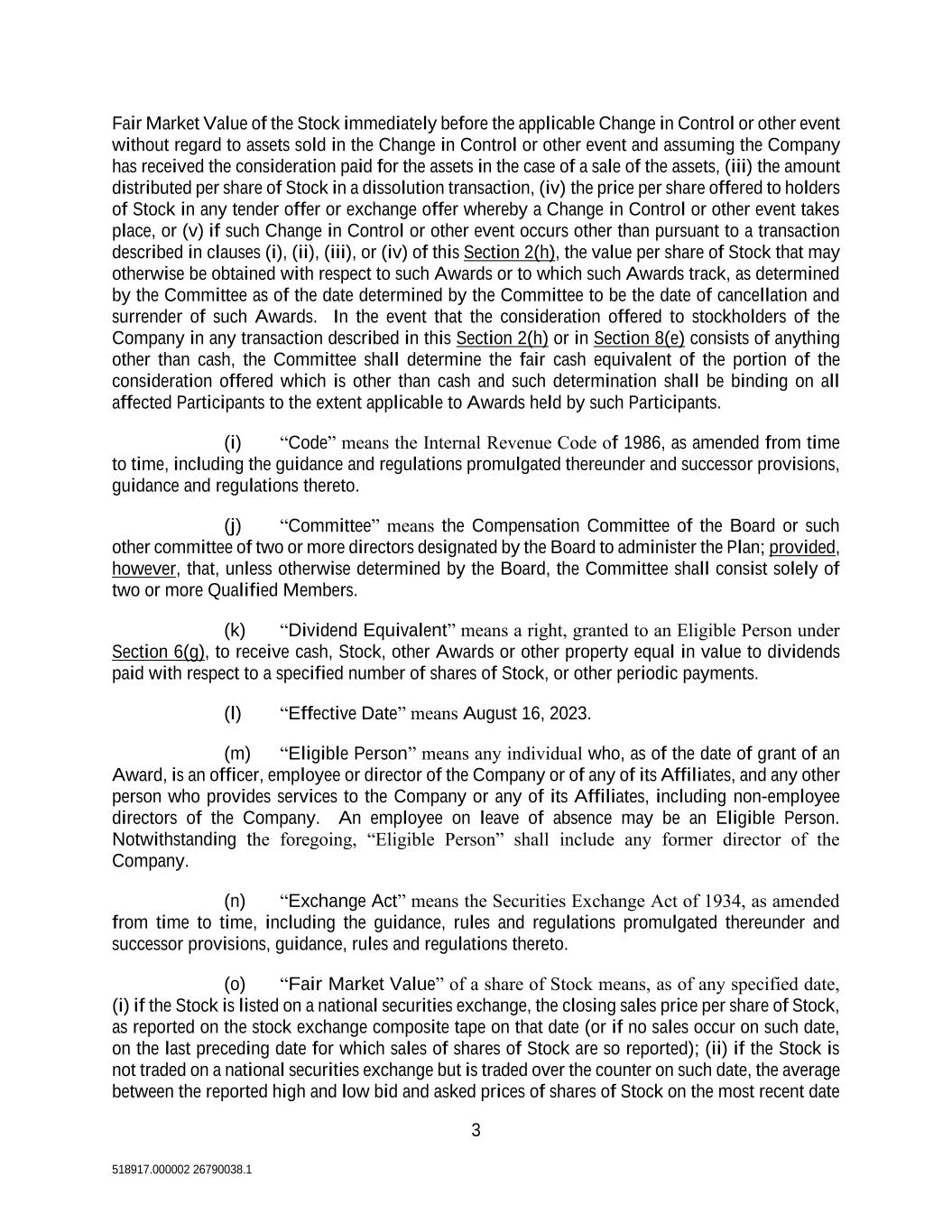 3 518917.000002 26790038.1 Fair Market Value of the Stock immediately before the applicable Change in Control or other event without regard to assets sold in the Change in Control or other event and assuming the Company has received the consideration paid for the assets in the case of a sale of the assets, (iii) the amount distributed per share of Stock in a dissolution transaction, (iv) the price per share offered to holders of Stock in any tender offer or exchange offer whereby a Change in Control or other event takes place, or (v) if such Change in Control or other event occurs other than pursuant to a transaction described in clauses (i), (ii), (iii), or (iv) of this Section 2(h), the value per share of Stock that may otherwise be obtained with respect to such Awards or to which such Awards track, as determined by the Committee as of the date determined by the Committee to be the date of cancellation and surrender of such Awards. In the event that the consideration offered to stockholders of the Company in any transaction described in this Section 2(h) or in Section 8(e) consists of anything other than cash, the Committee shall determine the fair cash equivalent of the portion of the consideration offered which is other than cash and such determination shall be binding on all affected Participants to the extent applicable to Awards held by such Participants. (i) “Code” means the Internal Revenue Code of 1986, as amended from time to time, including the guidance and regulations promulgated thereunder and successor provisions, guidance and regulations thereto. (j) “Committee” means the Compensation Committee of the Board or such other committee of two or more directors designated by the Board to administer the Plan; provided, however, that, unless otherwise determined by the Board, the Committee shall consist solely of two or more Qualified Members. (k) “Dividend Equivalent” means a right, granted to an Eligible Person under Section 6(g), to receive cash, Stock, other Awards or other property equal in value to dividends paid with respect to a specified number of shares of Stock, or other periodic payments. (l) “Effective Date” means August 16, 2023. (m) “Eligible Person” means any individual who, as of the date of grant of an Award, is an officer, employee or director of the Company or of any of its Affiliates, and any other person who provides services to the Company or any of its Affiliates, including non-employee directors of the Company. An employee on leave of absence may be an Eligible Person. Notwithstanding the foregoing, “Eligible Person” shall include any former director of the Company. (n) “Exchange Act” means the Securities Exchange Act of 1934, as amended from time to time, including the guidance, rules and regulations promulgated thereunder and successor provisions, guidance, rules and regulations thereto. (o) “Fair Market Value” of a share of Stock means, as of any specified date, (i) if the Stock is listed on a national securities exchange, the closing sales price per share of Stock, as reported on the stock exchange composite tape on that date (or if no sales occur on such date, on the last preceding date for which sales of shares of Stock are so reported); (ii) if the Stock is not traded on a national securities exchange but is traded over the counter on such date, the average between the reported high and low bid and asked prices of shares of Stock on the most recent date