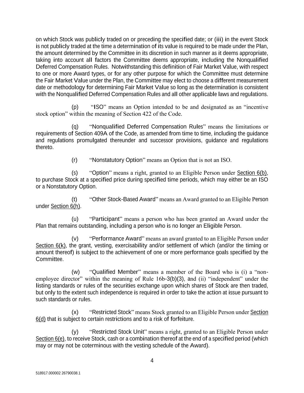 4 518917.000002 26790038.1 on which Stock was publicly traded on or preceding the specified date; or (iii) in the event Stock is not publicly traded at the time a determination of its value is required to be made under the Plan, the amount determined by the Committee in its discretion in such manner as it deems appropriate, taking into account all factors the Committee deems appropriate, including the Nonqualified Deferred Compensation Rules. Notwithstanding this definition of Fair Market Value, with respect to one or more Award types, or for any other purpose for which the Committee must determine the Fair Market Value under the Plan, the Committee may elect to choose a different measurement date or methodology for determining Fair Market Value so long as the determination is consistent with the Nonqualified Deferred Compensation Rules and all other applicable laws and regulations. (p) “ISO” means an Option intended to be and designated as an “incentive stock option” within the meaning of Section 422 of the Code. (q) “Nonqualified Deferred Compensation Rules” means the limitations or requirements of Section 409A of the Code, as amended from time to time, including the guidance and regulations promulgated thereunder and successor provisions, guidance and regulations thereto. (r) “Nonstatutory Option” means an Option that is not an ISO. (s) “Option” means a right, granted to an Eligible Person under Section 6(b), to purchase Stock at a specified price during specified time periods, which may either be an ISO or a Nonstatutory Option. (t) “Other Stock-Based Award” means an Award granted to an Eligible Person under Section 6(h). (u) “Participant” means a person who has been granted an Award under the Plan that remains outstanding, including a person who is no longer an Eligible Person. (v) “Performance Award” means an award granted to an Eligible Person under Section 6(k), the grant, vesting, exercisability and/or settlement of which (and/or the timing or amount thereof) is subject to the achievement of one or more performance goals specified by the Committee. (w) “Qualified Member” means a member of the Board who is (i) a “non- employee director” within the meaning of Rule 16b-3(b)(3), and (ii) “independent” under the listing standards or rules of the securities exchange upon which shares of Stock are then traded, but only to the extent such independence is required in order to take the action at issue pursuant to such standards or rules. (x) “Restricted Stock” means Stock granted to an Eligible Person under Section 6(d) that is subject to certain restrictions and to a risk of forfeiture. (y) “Restricted Stock Unit” means a right, granted to an Eligible Person under Section 6(e), to receive Stock, cash or a combination thereof at the end of a specified period (which may or may not be coterminous with the vesting schedule of the Award).