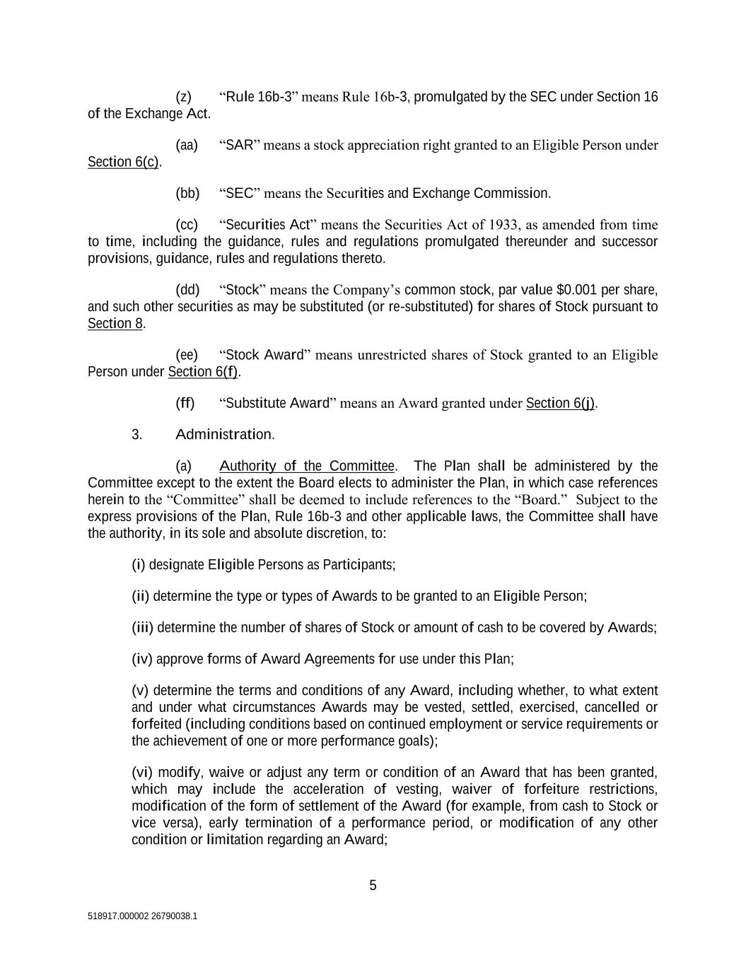 5 518917.000002 26790038.1 (z) “Rule 16b-3” means Rule 16b-3, promulgated by the SEC under Section 16 of the Exchange Act. (aa) “SAR” means a stock appreciation right granted to an Eligible Person under Section 6(c). (bb) “SEC” means the Securities and Exchange Commission. (cc) “Securities Act” means the Securities Act of 1933, as amended from time to time, including the guidance, rules and regulations promulgated thereunder and successor provisions, guidance, rules and regulations thereto. (dd) “Stock” means the Company’s common stock, par value $0.001 per share, and such other securities as may be substituted (or re-substituted) for shares of Stock pursuant to Section 8. (ee) “Stock Award” means unrestricted shares of Stock granted to an Eligible Person under Section 6(f). (ff) “Substitute Award” means an Award granted under Section 6(j). 3. Administration. (a) Authority of the Committee. The Plan shall be administered by the Committee except to the extent the Board elects to administer the Plan, in which case references herein to the “Committee” shall be deemed to include references to the “Board.” Subject to the express provisions of the Plan, Rule 16b-3 and other applicable laws, the Committee shall have the authority, in its sole and absolute discretion, to: (i) designate Eligible Persons as Participants; (ii) determine the type or types of Awards to be granted to an Eligible Person; (iii) determine the number of shares of Stock or amount of cash to be covered by Awards; (iv) approve forms of Award Agreements for use under this Plan; (v) determine the terms and conditions of any Award, including whether, to what extent and under what circumstances Awards may be vested, settled, exercised, cancelled or forfeited (including conditions based on continued employment or service requirements or the achievement of one or more performance goals); (vi) modify, waive or adjust any term or condition of an Award that has been granted, which may include the acceleration of vesting, waiver of forfeiture restrictions, modification of the form of settlement of the Award (for example, from cash to Stock or vice versa), early termination of a performance period, or modification of any other condition or limitation regarding an Award;