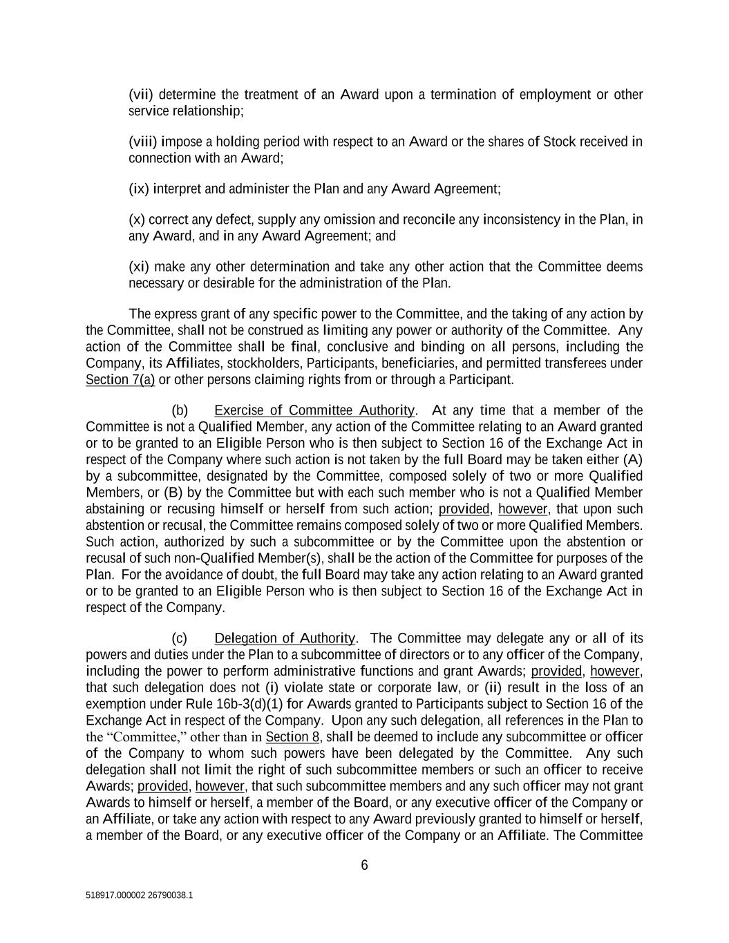 6 518917.000002 26790038.1 (vii) determine the treatment of an Award upon a termination of employment or other service relationship; (viii) impose a holding period with respect to an Award or the shares of Stock received in connection with an Award; (ix) interpret and administer the Plan and any Award Agreement; (x) correct any defect, supply any omission and reconcile any inconsistency in the Plan, in any Award, and in any Award Agreement; and (xi) make any other determination and take any other action that the Committee deems necessary or desirable for the administration of the Plan. The express grant of any specific power to the Committee, and the taking of any action by the Committee, shall not be construed as limiting any power or authority of the Committee. Any action of the Committee shall be final, conclusive and binding on all persons, including the Company, its Affiliates, stockholders, Participants, beneficiaries, and permitted transferees under Section 7(a) or other persons claiming rights from or through a Participant. (b) Exercise of Committee Authority. At any time that a member of the Committee is not a Qualified Member, any action of the Committee relating to an Award granted or to be granted to an Eligible Person who is then subject to Section 16 of the Exchange Act in respect of the Company where such action is not taken by the full Board may be taken either (A) by a subcommittee, designated by the Committee, composed solely of two or more Qualified Members, or (B) by the Committee but with each such member who is not a Qualified Member abstaining or recusing himself or herself from such action; provided, however, that upon such abstention or recusal, the Committee remains composed solely of two or more Qualified Members. Such action, authorized by such a subcommittee or by the Committee upon the abstention or recusal of such non-Qualified Member(s), shall be the action of the Committee for purposes of the Plan. For the avoidance of doubt, the full Board may take any action relating to an Award granted or to be granted to an Eligible Person who is then subject to Section 16 of the Exchange Act in respect of the Company. (c) Delegation of Authority. The Committee may delegate any or all of its powers and duties under the Plan to a subcommittee of directors or to any officer of the Company, including the power to perform administrative functions and grant Awards; provided, however, that such delegation does not (i) violate state or corporate law, or (ii) result in the loss of an exemption under Rule 16b-3(d)(1) for Awards granted to Participants subject to Section 16 of the Exchange Act in respect of the Company. Upon any such delegation, all references in the Plan to the “Committee,” other than in Section 8, shall be deemed to include any subcommittee or officer of the Company to whom such powers have been delegated by the Committee. Any such delegation shall not limit the right of such subcommittee members or such an officer to receive Awards; provided, however, that such subcommittee members and any such officer may not grant Awards to himself or herself, a member of the Board, or any executive officer of the Company or an Affiliate, or take any action with respect to any Award previously granted to himself or herself, a member of the Board, or any executive officer of the Company or an Affiliate. The Committee