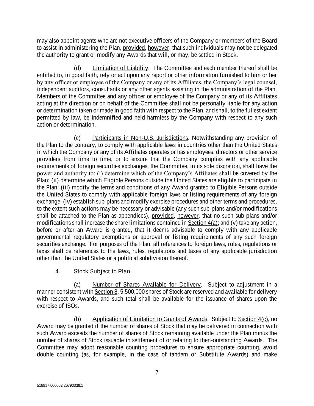 7 518917.000002 26790038.1 may also appoint agents who are not executive officers of the Company or members of the Board to assist in administering the Plan, provided, however, that such individuals may not be delegated the authority to grant or modify any Awards that will, or may, be settled in Stock. (d) Limitation of Liability. The Committee and each member thereof shall be entitled to, in good faith, rely or act upon any report or other information furnished to him or her by any officer or employee of the Company or any of its Affiliates, the Company’s legal counsel, independent auditors, consultants or any other agents assisting in the administration of the Plan. Members of the Committee and any officer or employee of the Company or any of its Affiliates acting at the direction or on behalf of the Committee shall not be personally liable for any action or determination taken or made in good faith with respect to the Plan, and shall, to the fullest extent permitted by law, be indemnified and held harmless by the Company with respect to any such action or determination. (e) Participants in Non-U.S. Jurisdictions. Notwithstanding any provision of the Plan to the contrary, to comply with applicable laws in countries other than the United States in which the Company or any of its Affiliates operates or has employees, directors or other service providers from time to time, or to ensure that the Company complies with any applicable requirements of foreign securities exchanges, the Committee, in its sole discretion, shall have the power and authority to: (i) determine which of the Company’s Affiliates shall be covered by the Plan; (ii) determine which Eligible Persons outside the United States are eligible to participate in the Plan; (iii) modify the terms and conditions of any Award granted to Eligible Persons outside the United States to comply with applicable foreign laws or listing requirements of any foreign exchange; (iv) establish sub-plans and modify exercise procedures and other terms and procedures, to the extent such actions may be necessary or advisable (any such sub-plans and/or modifications shall be attached to the Plan as appendices), provided, however, that no such sub-plans and/or modifications shall increase the share limitations contained in Section 4(a); and (v) take any action, before or after an Award is granted, that it deems advisable to comply with any applicable governmental regulatory exemptions or approval or listing requirements of any such foreign securities exchange. For purposes of the Plan, all references to foreign laws, rules, regulations or taxes shall be references to the laws, rules, regulations and taxes of any applicable jurisdiction other than the United States or a political subdivision thereof. 4. Stock Subject to Plan. (a) Number of Shares Available for Delivery. Subject to adjustment in a manner consistent with Section 8, 5,500,000 shares of Stock are reserved and available for delivery with respect to Awards, and such total shall be available for the issuance of shares upon the exercise of ISOs. (b) Application of Limitation to Grants of Awards. Subject to Section 4(c), no Award may be granted if the number of shares of Stock that may be delivered in connection with such Award exceeds the number of shares of Stock remaining available under the Plan minus the number of shares of Stock issuable in settlement of or relating to then-outstanding Awards. The Committee may adopt reasonable counting procedures to ensure appropriate counting, avoid double counting (as, for example, in the case of tandem or Substitute Awards) and make