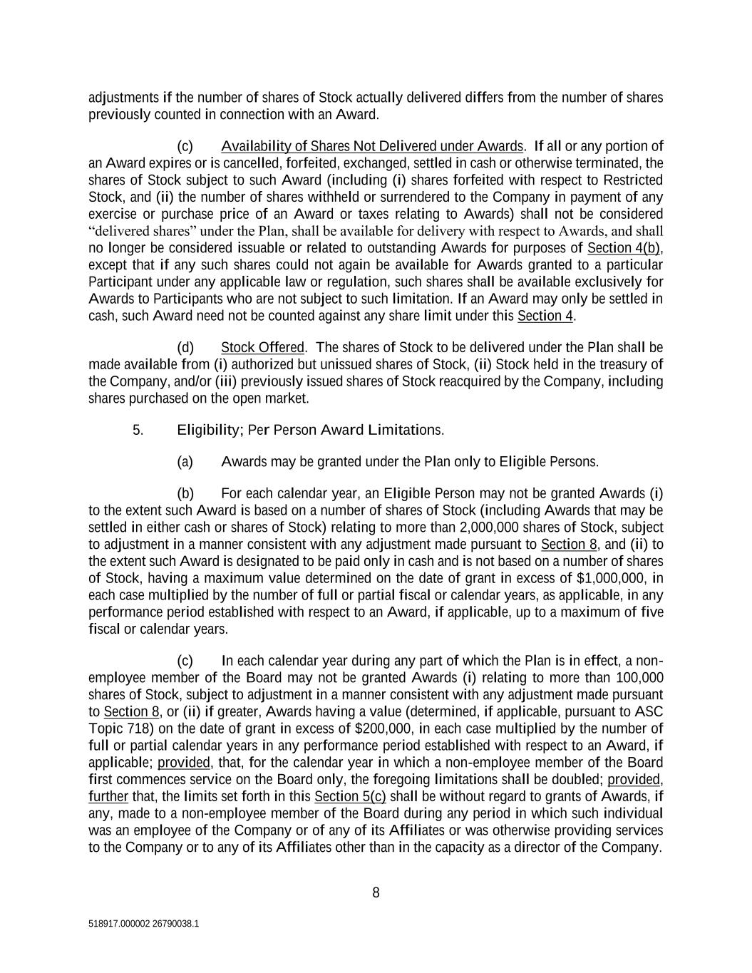 8 518917.000002 26790038.1 adjustments if the number of shares of Stock actually delivered differs from the number of shares previously counted in connection with an Award. (c) Availability of Shares Not Delivered under Awards. If all or any portion of an Award expires or is cancelled, forfeited, exchanged, settled in cash or otherwise terminated, the shares of Stock subject to such Award (including (i) shares forfeited with respect to Restricted Stock, and (ii) the number of shares withheld or surrendered to the Company in payment of any exercise or purchase price of an Award or taxes relating to Awards) shall not be considered “delivered shares” under the Plan, shall be available for delivery with respect to Awards, and shall no longer be considered issuable or related to outstanding Awards for purposes of Section 4(b), except that if any such shares could not again be available for Awards granted to a particular Participant under any applicable law or regulation, such shares shall be available exclusively for Awards to Participants who are not subject to such limitation. If an Award may only be settled in cash, such Award need not be counted against any share limit under this Section 4. (d) Stock Offered. The shares of Stock to be delivered under the Plan shall be made available from (i) authorized but unissued shares of Stock, (ii) Stock held in the treasury of the Company, and/or (iii) previously issued shares of Stock reacquired by the Company, including shares purchased on the open market. 5. Eligibility; Per Person Award Limitations. (a) Awards may be granted under the Plan only to Eligible Persons. (b) For each calendar year, an Eligible Person may not be granted Awards (i) to the extent such Award is based on a number of shares of Stock (including Awards that may be settled in either cash or shares of Stock) relating to more than 2,000,000 shares of Stock, subject to adjustment in a manner consistent with any adjustment made pursuant to Section 8, and (ii) to the extent such Award is designated to be paid only in cash and is not based on a number of shares of Stock, having a maximum value determined on the date of grant in excess of $1,000,000, in each case multiplied by the number of full or partial fiscal or calendar years, as applicable, in any performance period established with respect to an Award, if applicable, up to a maximum of five fiscal or calendar years. (c) In each calendar year during any part of which the Plan is in effect, a non- employee member of the Board may not be granted Awards (i) relating to more than 100,000 shares of Stock, subject to adjustment in a manner consistent with any adjustment made pursuant to Section 8, or (ii) if greater, Awards having a value (determined, if applicable, pursuant to ASC Topic 718) on the date of grant in excess of $200,000, in each case multiplied by the number of full or partial calendar years in any performance period established with respect to an Award, if applicable; provided, that, for the calendar year in which a non-employee member of the Board first commences service on the Board only, the foregoing limitations shall be doubled; provided, further that, the limits set forth in this Section 5(c) shall be without regard to grants of Awards, if any, made to a non-employee member of the Board during any period in which such individual was an employee of the Company or of any of its Affiliates or was otherwise providing services to the Company or to any of its Affiliates other than in the capacity as a director of the Company.