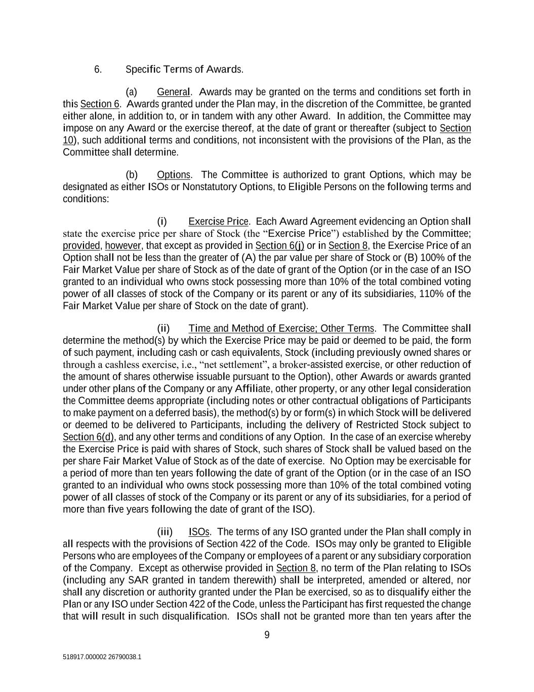 9 518917.000002 26790038.1 6. Specific Terms of Awards. (a) General. Awards may be granted on the terms and conditions set forth in this Section 6. Awards granted under the Plan may, in the discretion of the Committee, be granted either alone, in addition to, or in tandem with any other Award. In addition, the Committee may impose on any Award or the exercise thereof, at the date of grant or thereafter (subject to Section 10), such additional terms and conditions, not inconsistent with the provisions of the Plan, as the Committee shall determine. (b) Options. The Committee is authorized to grant Options, which may be designated as either ISOs or Nonstatutory Options, to Eligible Persons on the following terms and conditions: (i) Exercise Price. Each Award Agreement evidencing an Option shall state the exercise price per share of Stock (the “Exercise Price”) established by the Committee; provided, however, that except as provided in Section 6(j) or in Section 8, the Exercise Price of an Option shall not be less than the greater of (A) the par value per share of Stock or (B) 100% of the Fair Market Value per share of Stock as of the date of grant of the Option (or in the case of an ISO granted to an individual who owns stock possessing more than 10% of the total combined voting power of all classes of stock of the Company or its parent or any of its subsidiaries, 110% of the Fair Market Value per share of Stock on the date of grant). (ii) Time and Method of Exercise; Other Terms. The Committee shall determine the method(s) by which the Exercise Price may be paid or deemed to be paid, the form of such payment, including cash or cash equivalents, Stock (including previously owned shares or through a cashless exercise, i.e., “net settlement”, a broker-assisted exercise, or other reduction of the amount of shares otherwise issuable pursuant to the Option), other Awards or awards granted under other plans of the Company or any Affiliate, other property, or any other legal consideration the Committee deems appropriate (including notes or other contractual obligations of Participants to make payment on a deferred basis), the method(s) by or form(s) in which Stock will be delivered or deemed to be delivered to Participants, including the delivery of Restricted Stock subject to Section 6(d), and any other terms and conditions of any Option. In the case of an exercise whereby the Exercise Price is paid with shares of Stock, such shares of Stock shall be valued based on the per share Fair Market Value of Stock as of the date of exercise. No Option may be exercisable for a period of more than ten years following the date of grant of the Option (or in the case of an ISO granted to an individual who owns stock possessing more than 10% of the total combined voting power of all classes of stock of the Company or its parent or any of its subsidiaries, for a period of more than five years following the date of grant of the ISO). (iii) ISOs. The terms of any ISO granted under the Plan shall comply in all respects with the provisions of Section 422 of the Code. ISOs may only be granted to Eligible Persons who are employees of the Company or employees of a parent or any subsidiary corporation of the Company. Except as otherwise provided in Section 8, no term of the Plan relating to ISOs (including any SAR granted in tandem therewith) shall be interpreted, amended or altered, nor shall any discretion or authority granted under the Plan be exercised, so as to disqualify either the Plan or any ISO under Section 422 of the Code, unless the Participant has first requested the change that will result in such disqualification. ISOs shall not be granted more than ten years after the
