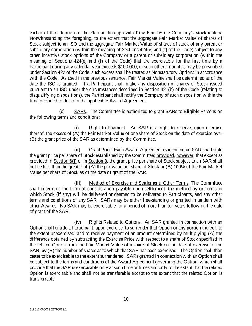 10 518917.000002 26790038.1 earlier of the adoption of the Plan or the approval of the Plan by the Company’s stockholders. Notwithstanding the foregoing, to the extent that the aggregate Fair Market Value of shares of Stock subject to an ISO and the aggregate Fair Market Value of shares of stock of any parent or subsidiary corporation (within the meaning of Sections 424(e) and (f) of the Code) subject to any other incentive stock options of the Company or a parent or subsidiary corporation (within the meaning of Sections 424(e) and (f) of the Code) that are exercisable for the first time by a Participant during any calendar year exceeds $100,000, or such other amount as may be prescribed under Section 422 of the Code, such excess shall be treated as Nonstatutory Options in accordance with the Code. As used in the previous sentence, Fair Market Value shall be determined as of the date the ISO is granted. If a Participant shall make any disposition of shares of Stock issued pursuant to an ISO under the circumstances described in Section 421(b) of the Code (relating to disqualifying dispositions), the Participant shall notify the Company of such disposition within the time provided to do so in the applicable Award Agreement. (c) SARs. The Committee is authorized to grant SARs to Eligible Persons on the following terms and conditions: (i) Right to Payment. An SAR is a right to receive, upon exercise thereof, the excess of (A) the Fair Market Value of one share of Stock on the date of exercise over (B) the grant price of the SAR as determined by the Committee. (ii) Grant Price. Each Award Agreement evidencing an SAR shall state the grant price per share of Stock established by the Committee; provided, however, that except as provided in Section 6(j) or in Section 8, the grant price per share of Stock subject to an SAR shall not be less than the greater of (A) the par value per share of Stock or (B) 100% of the Fair Market Value per share of Stock as of the date of grant of the SAR. (iii) Method of Exercise and Settlement; Other Terms. The Committee shall determine the form of consideration payable upon settlement, the method by or forms in which Stock (if any) will be delivered or deemed to be delivered to Participants, and any other terms and conditions of any SAR. SARs may be either free-standing or granted in tandem with other Awards. No SAR may be exercisable for a period of more than ten years following the date of grant of the SAR. (iv) Rights Related to Options. An SAR granted in connection with an Option shall entitle a Participant, upon exercise, to surrender that Option or any portion thereof, to the extent unexercised, and to receive payment of an amount determined by multiplying (A) the difference obtained by subtracting the Exercise Price with respect to a share of Stock specified in the related Option from the Fair Market Value of a share of Stock on the date of exercise of the SAR, by (B) the number of shares as to which that SAR has been exercised. The Option shall then cease to be exercisable to the extent surrendered. SARs granted in connection with an Option shall be subject to the terms and conditions of the Award Agreement governing the Option, which shall provide that the SAR is exercisable only at such time or times and only to the extent that the related Option is exercisable and shall not be transferable except to the extent that the related Option is transferrable.