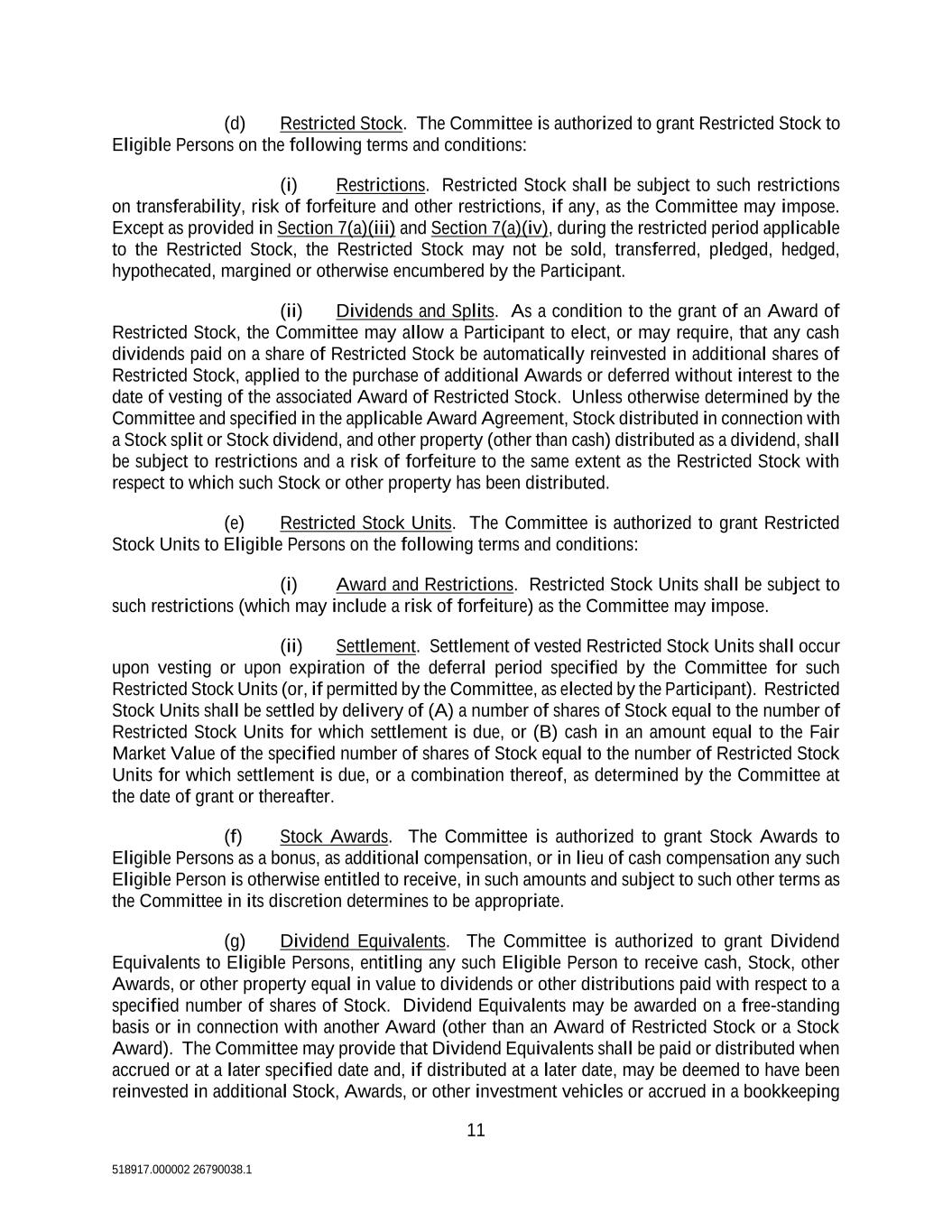 11 518917.000002 26790038.1 (d) Restricted Stock. The Committee is authorized to grant Restricted Stock to Eligible Persons on the following terms and conditions: (i) Restrictions. Restricted Stock shall be subject to such restrictions on transferability, risk of forfeiture and other restrictions, if any, as the Committee may impose. Except as provided in Section 7(a)(iii) and Section 7(a)(iv), during the restricted period applicable to the Restricted Stock, the Restricted Stock may not be sold, transferred, pledged, hedged, hypothecated, margined or otherwise encumbered by the Participant. (ii) Dividends and Splits. As a condition to the grant of an Award of Restricted Stock, the Committee may allow a Participant to elect, or may require, that any cash dividends paid on a share of Restricted Stock be automatically reinvested in additional shares of Restricted Stock, applied to the purchase of additional Awards or deferred without interest to the date of vesting of the associated Award of Restricted Stock. Unless otherwise determined by the Committee and specified in the applicable Award Agreement, Stock distributed in connection with a Stock split or Stock dividend, and other property (other than cash) distributed as a dividend, shall be subject to restrictions and a risk of forfeiture to the same extent as the Restricted Stock with respect to which such Stock or other property has been distributed. (e) Restricted Stock Units. The Committee is authorized to grant Restricted Stock Units to Eligible Persons on the following terms and conditions: (i) Award and Restrictions. Restricted Stock Units shall be subject to such restrictions (which may include a risk of forfeiture) as the Committee may impose. (ii) Settlement. Settlement of vested Restricted Stock Units shall occur upon vesting or upon expiration of the deferral period specified by the Committee for such Restricted Stock Units (or, if permitted by the Committee, as elected by the Participant). Restricted Stock Units shall be settled by delivery of (A) a number of shares of Stock equal to the number of Restricted Stock Units for which settlement is due, or (B) cash in an amount equal to the Fair Market Value of the specified number of shares of Stock equal to the number of Restricted Stock Units for which settlement is due, or a combination thereof, as determined by the Committee at the date of grant or thereafter. (f) Stock Awards. The Committee is authorized to grant Stock Awards to Eligible Persons as a bonus, as additional compensation, or in lieu of cash compensation any such Eligible Person is otherwise entitled to receive, in such amounts and subject to such other terms as the Committee in its discretion determines to be appropriate. (g) Dividend Equivalents. The Committee is authorized to grant Dividend Equivalents to Eligible Persons, entitling any such Eligible Person to receive cash, Stock, other Awards, or other property equal in value to dividends or other distributions paid with respect to a specified number of shares of Stock. Dividend Equivalents may be awarded on a free-standing basis or in connection with another Award (other than an Award of Restricted Stock or a Stock Award). The Committee may provide that Dividend Equivalents shall be paid or distributed when accrued or at a later specified date and, if distributed at a later date, may be deemed to have been reinvested in additional Stock, Awards, or other investment vehicles or accrued in a bookkeeping