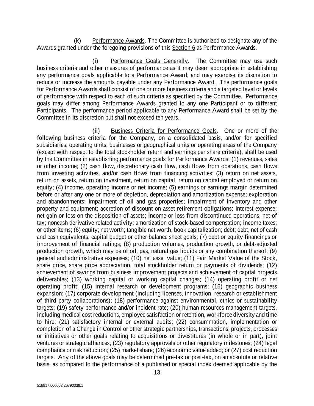 13 518917.000002 26790038.1 (k) Performance Awards. The Committee is authorized to designate any of the Awards granted under the foregoing provisions of this Section 6 as Performance Awards. (i) Performance Goals Generally. The Committee may use such business criteria and other measures of performance as it may deem appropriate in establishing any performance goals applicable to a Performance Award, and may exercise its discretion to reduce or increase the amounts payable under any Performance Award. The performance goals for Performance Awards shall consist of one or more business criteria and a targeted level or levels of performance with respect to each of such criteria as specified by the Committee. Performance goals may differ among Performance Awards granted to any one Participant or to different Participants. The performance period applicable to any Performance Award shall be set by the Committee in its discretion but shall not exceed ten years. (ii) Business Criteria for Performance Goals. One or more of the following business criteria for the Company, on a consolidated basis, and/or for specified subsidiaries, operating units, businesses or geographical units or operating areas of the Company (except with respect to the total stockholder return and earnings per share criteria), shall be used by the Committee in establishing performance goals for Performance Awards: (1) revenues, sales or other income; (2) cash flow, discretionary cash flow, cash flows from operations, cash flows from investing activities, and/or cash flows from financing activities; (3) return on net assets, return on assets, return on investment, return on capital, return on capital employed or return on equity; (4) income, operating income or net income; (5) earnings or earnings margin determined before or after any one or more of depletion, depreciation and amortization expense; exploration and abandonments; impairment of oil and gas properties; impairment of inventory and other property and equipment; accretion of discount on asset retirement obligations; interest expense; net gain or loss on the disposition of assets; income or loss from discontinued operations, net of tax; noncash derivative related activity; amortization of stock-based compensation; income taxes; or other items; (6) equity; net worth; tangible net worth; book capitalization; debt; debt, net of cash and cash equivalents; capital budget or other balance sheet goals; (7) debt or equity financings or improvement of financial ratings; (8) production volumes, production growth, or debt-adjusted production growth, which may be of oil, gas, natural gas liquids or any combination thereof; (9) general and administrative expenses; (10) net asset value; (11) Fair Market Value of the Stock, share price, share price appreciation, total stockholder return or payments of dividends; (12) achievement of savings from business improvement projects and achievement of capital projects deliverables; (13) working capital or working capital changes; (14) operating profit or net operating profit; (15) internal research or development programs; (16) geographic business expansion; (17) corporate development (including licenses, innovation, research or establishment of third party collaborations); (18) performance against environmental, ethics or sustainability targets; (19) safety performance and/or incident rate; (20) human resources management targets, including medical cost reductions, employee satisfaction or retention, workforce diversity and time to hire; (21) satisfactory internal or external audits; (22) consummation, implementation or completion of a Change in Control or other strategic partnerships, transactions, projects, processes or initiatives or other goals relating to acquisitions or divestitures (in whole or in part), joint ventures or strategic alliances; (23) regulatory approvals or other regulatory milestones; (24) legal compliance or risk reduction; (25) market share; (26) economic value added; or (27) cost reduction targets. Any of the above goals may be determined pre-tax or post-tax, on an absolute or relative basis, as compared to the performance of a published or special index deemed applicable by the