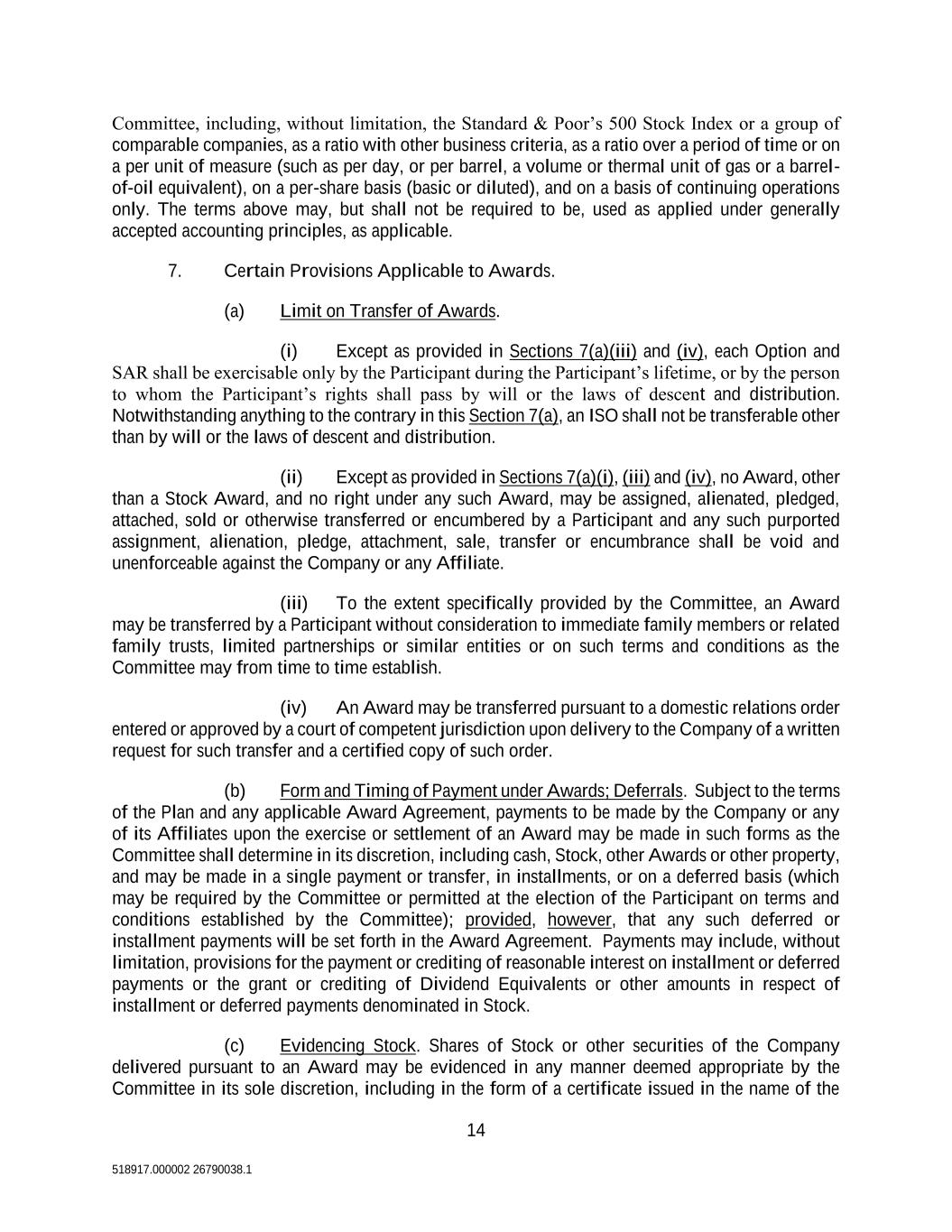 14 518917.000002 26790038.1 Committee, including, without limitation, the Standard & Poor’s 500 Stock Index or a group of comparable companies, as a ratio with other business criteria, as a ratio over a period of time or on a per unit of measure (such as per day, or per barrel, a volume or thermal unit of gas or a barrel- of-oil equivalent), on a per-share basis (basic or diluted), and on a basis of continuing operations only. The terms above may, but shall not be required to be, used as applied under generally accepted accounting principles, as applicable. 7. Certain Provisions Applicable to Awards. (a) Limit on Transfer of Awards. (i) Except as provided in Sections 7(a)(iii) and (iv), each Option and SAR shall be exercisable only by the Participant during the Participant’s lifetime, or by the person to whom the Participant’s rights shall pass by will or the laws of descent and distribution. Notwithstanding anything to the contrary in this Section 7(a), an ISO shall not be transferable other than by will or the laws of descent and distribution. (ii) Except as provided in Sections 7(a)(i), (iii) and (iv), no Award, other than a Stock Award, and no right under any such Award, may be assigned, alienated, pledged, attached, sold or otherwise transferred or encumbered by a Participant and any such purported assignment, alienation, pledge, attachment, sale, transfer or encumbrance shall be void and unenforceable against the Company or any Affiliate. (iii) To the extent specifically provided by the Committee, an Award may be transferred by a Participant without consideration to immediate family members or related family trusts, limited partnerships or similar entities or on such terms and conditions as the Committee may from time to time establish. (iv) An Award may be transferred pursuant to a domestic relations order entered or approved by a court of competent jurisdiction upon delivery to the Company of a written request for such transfer and a certified copy of such order. (b) Form and Timing of Payment under Awards; Deferrals. Subject to the terms of the Plan and any applicable Award Agreement, payments to be made by the Company or any of its Affiliates upon the exercise or settlement of an Award may be made in such forms as the Committee shall determine in its discretion, including cash, Stock, other Awards or other property, and may be made in a single payment or transfer, in installments, or on a deferred basis (which may be required by the Committee or permitted at the election of the Participant on terms and conditions established by the Committee); provided, however, that any such deferred or installment payments will be set forth in the Award Agreement. Payments may include, without limitation, provisions for the payment or crediting of reasonable interest on installment or deferred payments or the grant or crediting of Dividend Equivalents or other amounts in respect of installment or deferred payments denominated in Stock. (c) Evidencing Stock. Shares of Stock or other securities of the Company delivered pursuant to an Award may be evidenced in any manner deemed appropriate by the Committee in its sole discretion, including in the form of a certificate issued in the name of the