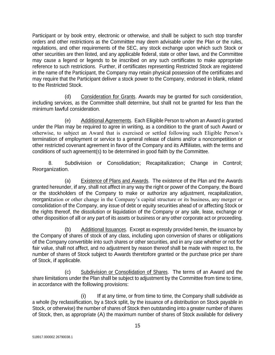 15 518917.000002 26790038.1 Participant or by book entry, electronic or otherwise, and shall be subject to such stop transfer orders and other restrictions as the Committee may deem advisable under the Plan or the rules, regulations, and other requirements of the SEC, any stock exchange upon which such Stock or other securities are then listed, and any applicable federal, state or other laws, and the Committee may cause a legend or legends to be inscribed on any such certificates to make appropriate reference to such restrictions. Further, if certificates representing Restricted Stock are registered in the name of the Participant, the Company may retain physical possession of the certificates and may require that the Participant deliver a stock power to the Company, endorsed in blank, related to the Restricted Stock. (d) Consideration for Grants. Awards may be granted for such consideration, including services, as the Committee shall determine, but shall not be granted for less than the minimum lawful consideration. (e) Additional Agreements. Each Eligible Person to whom an Award is granted under the Plan may be required to agree in writing, as a condition to the grant of such Award or otherwise, to subject an Award that is exercised or settled following such Eligible Person’s termination of employment or service to a general release of claims and/or a noncompetition or other restricted covenant agreement in favor of the Company and its Affiliates, with the terms and conditions of such agreement(s) to be determined in good faith by the Committee. 8. Subdivision or Consolidation; Recapitalization; Change in Control; Reorganization. (a) Existence of Plans and Awards. The existence of the Plan and the Awards granted hereunder, if any, shall not affect in any way the right or power of the Company, the Board or the stockholders of the Company to make or authorize any adjustment, recapitalization, reorganization or other change in the Company’s capital structure or its business, any merger or consolidation of the Company, any issue of debt or equity securities ahead of or affecting Stock or the rights thereof, the dissolution or liquidation of the Company or any sale, lease, exchange or other disposition of all or any part of its assets or business or any other corporate act or proceeding. (b) Additional Issuances. Except as expressly provided herein, the issuance by the Company of shares of stock of any class, including upon conversion of shares or obligations of the Company convertible into such shares or other securities, and in any case whether or not for fair value, shall not affect, and no adjustment by reason thereof shall be made with respect to, the number of shares of Stock subject to Awards theretofore granted or the purchase price per share of Stock, if applicable. (c) Subdivision or Consolidation of Shares. The terms of an Award and the share limitations under the Plan shall be subject to adjustment by the Committee from time to time, in accordance with the following provisions: (i) If at any time, or from time to time, the Company shall subdivide as a whole (by reclassification, by a Stock split, by the issuance of a distribution on Stock payable in Stock, or otherwise) the number of shares of Stock then outstanding into a greater number of shares of Stock, then, as appropriate (A) the maximum number of shares of Stock available for delivery