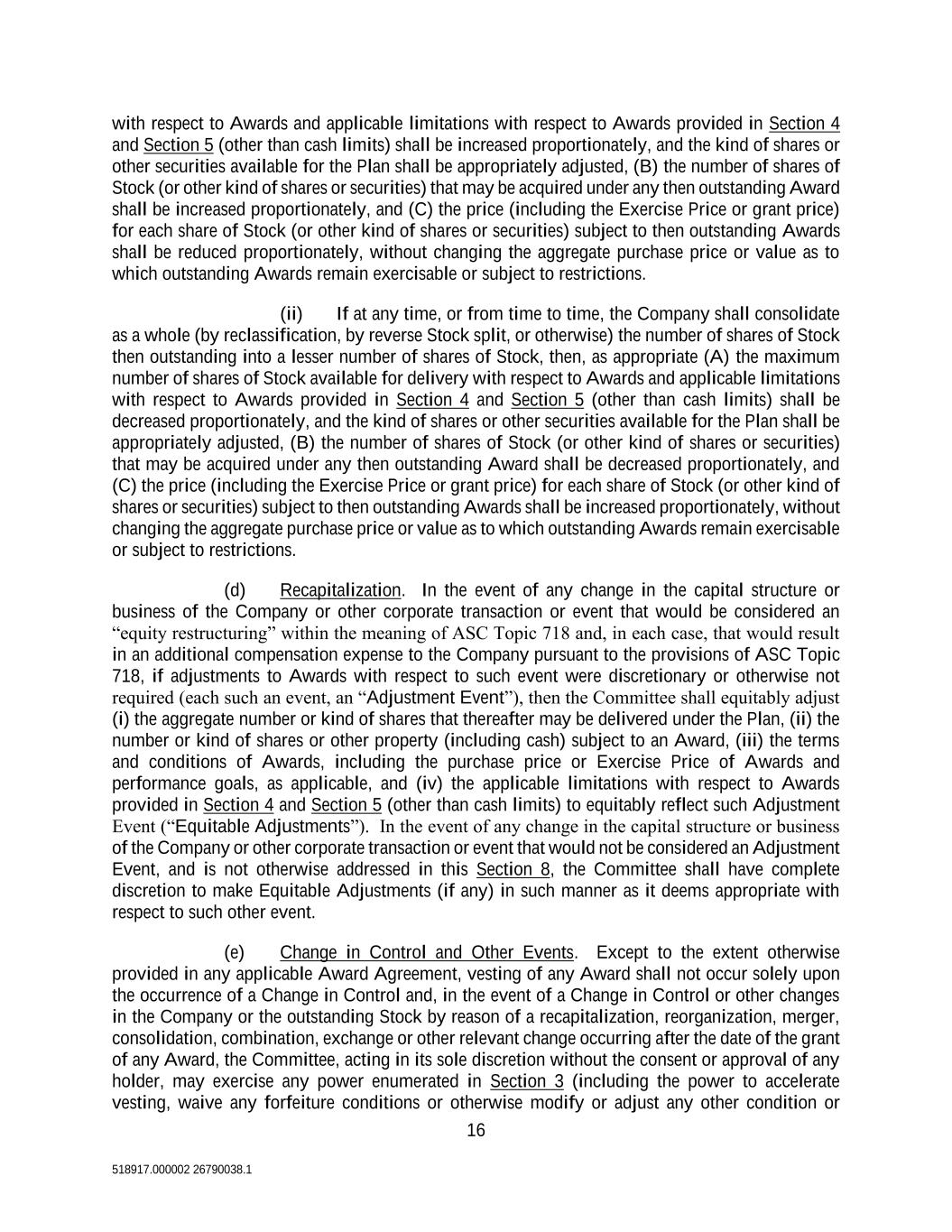 16 518917.000002 26790038.1 with respect to Awards and applicable limitations with respect to Awards provided in Section 4 and Section 5 (other than cash limits) shall be increased proportionately, and the kind of shares or other securities available for the Plan shall be appropriately adjusted, (B) the number of shares of Stock (or other kind of shares or securities) that may be acquired under any then outstanding Award shall be increased proportionately, and (C) the price (including the Exercise Price or grant price) for each share of Stock (or other kind of shares or securities) subject to then outstanding Awards shall be reduced proportionately, without changing the aggregate purchase price or value as to which outstanding Awards remain exercisable or subject to restrictions. (ii) If at any time, or from time to time, the Company shall consolidate as a whole (by reclassification, by reverse Stock split, or otherwise) the number of shares of Stock then outstanding into a lesser number of shares of Stock, then, as appropriate (A) the maximum number of shares of Stock available for delivery with respect to Awards and applicable limitations with respect to Awards provided in Section 4 and Section 5 (other than cash limits) shall be decreased proportionately, and the kind of shares or other securities available for the Plan shall be appropriately adjusted, (B) the number of shares of Stock (or other kind of shares or securities) that may be acquired under any then outstanding Award shall be decreased proportionately, and (C) the price (including the Exercise Price or grant price) for each share of Stock (or other kind of shares or securities) subject to then outstanding Awards shall be increased proportionately, without changing the aggregate purchase price or value as to which outstanding Awards remain exercisable or subject to restrictions. (d) Recapitalization. In the event of any change in the capital structure or business of the Company or other corporate transaction or event that would be considered an “equity restructuring” within the meaning of ASC Topic 718 and, in each case, that would result in an additional compensation expense to the Company pursuant to the provisions of ASC Topic 718, if adjustments to Awards with respect to such event were discretionary or otherwise not required (each such an event, an “Adjustment Event”), then the Committee shall equitably adjust (i) the aggregate number or kind of shares that thereafter may be delivered under the Plan, (ii) the number or kind of shares or other property (including cash) subject to an Award, (iii) the terms and conditions of Awards, including the purchase price or Exercise Price of Awards and performance goals, as applicable, and (iv) the applicable limitations with respect to Awards provided in Section 4 and Section 5 (other than cash limits) to equitably reflect such Adjustment Event (“Equitable Adjustments”). In the event of any change in the capital structure or business of the Company or other corporate transaction or event that would not be considered an Adjustment Event, and is not otherwise addressed in this Section 8, the Committee shall have complete discretion to make Equitable Adjustments (if any) in such manner as it deems appropriate with respect to such other event. (e) Change in Control and Other Events. Except to the extent otherwise provided in any applicable Award Agreement, vesting of any Award shall not occur solely upon the occurrence of a Change in Control and, in the event of a Change in Control or other changes in the Company or the outstanding Stock by reason of a recapitalization, reorganization, merger, consolidation, combination, exchange or other relevant change occurring after the date of the grant of any Award, the Committee, acting in its sole discretion without the consent or approval of any holder, may exercise any power enumerated in Section 3 (including the power to accelerate vesting, waive any forfeiture conditions or otherwise modify or adjust any other condition or
