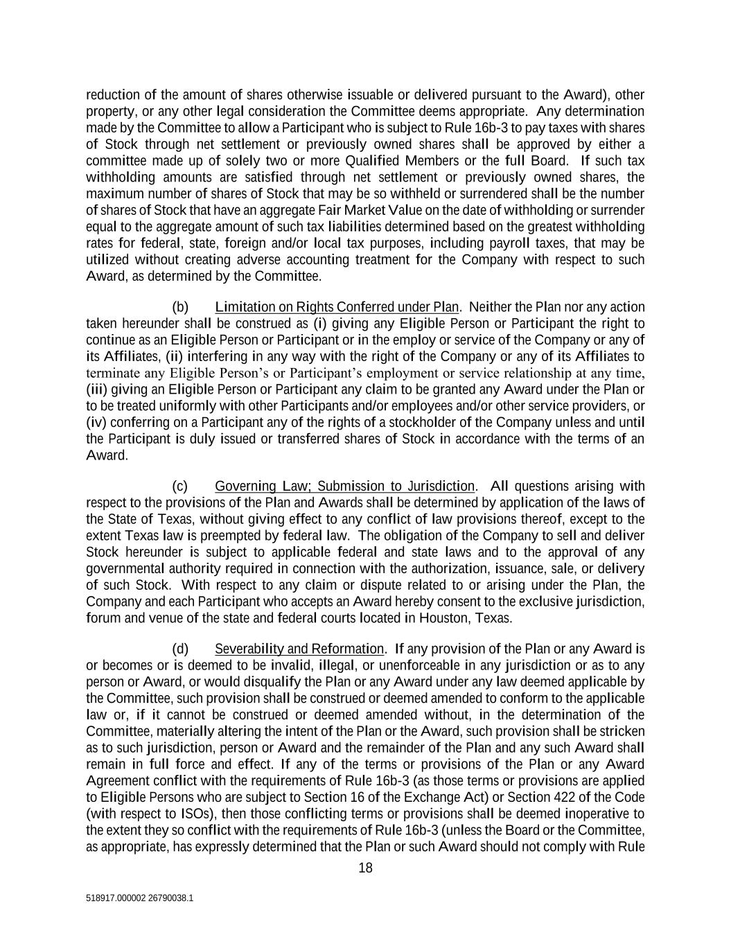 18 518917.000002 26790038.1 reduction of the amount of shares otherwise issuable or delivered pursuant to the Award), other property, or any other legal consideration the Committee deems appropriate. Any determination made by the Committee to allow a Participant who is subject to Rule 16b-3 to pay taxes with shares of Stock through net settlement or previously owned shares shall be approved by either a committee made up of solely two or more Qualified Members or the full Board. If such tax withholding amounts are satisfied through net settlement or previously owned shares, the maximum number of shares of Stock that may be so withheld or surrendered shall be the number of shares of Stock that have an aggregate Fair Market Value on the date of withholding or surrender equal to the aggregate amount of such tax liabilities determined based on the greatest withholding rates for federal, state, foreign and/or local tax purposes, including payroll taxes, that may be utilized without creating adverse accounting treatment for the Company with respect to such Award, as determined by the Committee. (b) Limitation on Rights Conferred under Plan. Neither the Plan nor any action taken hereunder shall be construed as (i) giving any Eligible Person or Participant the right to continue as an Eligible Person or Participant or in the employ or service of the Company or any of its Affiliates, (ii) interfering in any way with the right of the Company or any of its Affiliates to terminate any Eligible Person’s or Participant’s employment or service relationship at any time, (iii) giving an Eligible Person or Participant any claim to be granted any Award under the Plan or to be treated uniformly with other Participants and/or employees and/or other service providers, or (iv) conferring on a Participant any of the rights of a stockholder of the Company unless and until the Participant is duly issued or transferred shares of Stock in accordance with the terms of an Award. (c) Governing Law; Submission to Jurisdiction. All questions arising with respect to the provisions of the Plan and Awards shall be determined by application of the laws of the State of Texas, without giving effect to any conflict of law provisions thereof, except to the extent Texas law is preempted by federal law. The obligation of the Company to sell and deliver Stock hereunder is subject to applicable federal and state laws and to the approval of any governmental authority required in connection with the authorization, issuance, sale, or delivery of such Stock. With respect to any claim or dispute related to or arising under the Plan, the Company and each Participant who accepts an Award hereby consent to the exclusive jurisdiction, forum and venue of the state and federal courts located in Houston, Texas. (d) Severability and Reformation. If any provision of the Plan or any Award is or becomes or is deemed to be invalid, illegal, or unenforceable in any jurisdiction or as to any person or Award, or would disqualify the Plan or any Award under any law deemed applicable by the Committee, such provision shall be construed or deemed amended to conform to the applicable law or, if it cannot be construed or deemed amended without, in the determination of the Committee, materially altering the intent of the Plan or the Award, such provision shall be stricken as to such jurisdiction, person or Award and the remainder of the Plan and any such Award shall remain in full force and effect. If any of the terms or provisions of the Plan or any Award Agreement conflict with the requirements of Rule 16b-3 (as those terms or provisions are applied to Eligible Persons who are subject to Section 16 of the Exchange Act) or Section 422 of the Code (with respect to ISOs), then those conflicting terms or provisions shall be deemed inoperative to the extent they so conflict with the requirements of Rule 16b-3 (unless the Board or the Committee, as appropriate, has expressly determined that the Plan or such Award should not comply with Rule