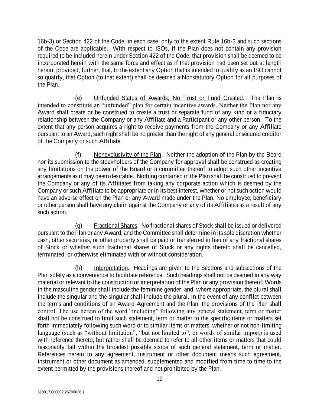 19 518917.000002 26790038.1 16b-3) or Section 422 of the Code, in each case, only to the extent Rule 16b-3 and such sections of the Code are applicable. With respect to ISOs, if the Plan does not contain any provision required to be included herein under Section 422 of the Code, that provision shall be deemed to be incorporated herein with the same force and effect as if that provision had been set out at length herein; provided, further, that, to the extent any Option that is intended to qualify as an ISO cannot so qualify, that Option (to that extent) shall be deemed a Nonstatutory Option for all purposes of the Plan. (e) Unfunded Status of Awards; No Trust or Fund Created. The Plan is intended to constitute an “unfunded” plan for certain incentive awards. Neither the Plan nor any Award shall create or be construed to create a trust or separate fund of any kind or a fiduciary relationship between the Company or any Affiliate and a Participant or any other person. To the extent that any person acquires a right to receive payments from the Company or any Affiliate pursuant to an Award, such right shall be no greater than the right of any general unsecured creditor of the Company or such Affiliate. (f) Nonexclusivity of the Plan. Neither the adoption of the Plan by the Board nor its submission to the stockholders of the Company for approval shall be construed as creating any limitations on the power of the Board or a committee thereof to adopt such other incentive arrangements as it may deem desirable. Nothing contained in the Plan shall be construed to prevent the Company or any of its Affiliates from taking any corporate action which is deemed by the Company or such Affiliate to be appropriate or in its best interest, whether or not such action would have an adverse effect on the Plan or any Award made under the Plan. No employee, beneficiary or other person shall have any claim against the Company or any of its Affiliates as a result of any such action. (g) Fractional Shares. No fractional shares of Stock shall be issued or delivered pursuant to the Plan or any Award, and the Committee shall determine in its sole discretion whether cash, other securities, or other property shall be paid or transferred in lieu of any fractional shares of Stock or whether such fractional shares of Stock or any rights thereto shall be cancelled, terminated, or otherwise eliminated with or without consideration. (h) Interpretation. Headings are given to the Sections and subsections of the Plan solely as a convenience to facilitate reference. Such headings shall not be deemed in any way material or relevant to the construction or interpretation of the Plan or any provision thereof. Words in the masculine gender shall include the feminine gender, and, where appropriate, the plural shall include the singular and the singular shall include the plural. In the event of any conflict between the terms and conditions of an Award Agreement and the Plan, the provisions of the Plan shall control. The use herein of the word “including” following any general statement, term or matter shall not be construed to limit such statement, term or matter to the specific items or matters set forth immediately following such word or to similar items or matters, whether or not non-limiting language (such as “without limitation”, “but not limited to”, or words of similar import) is used with reference thereto, but rather shall be deemed to refer to all other items or matters that could reasonably fall within the broadest possible scope of such general statement, term or matter. References herein to any agreement, instrument or other document means such agreement, instrument or other document as amended, supplemented and modified from time to time to the extent permitted by the provisions thereof and not prohibited by the Plan.