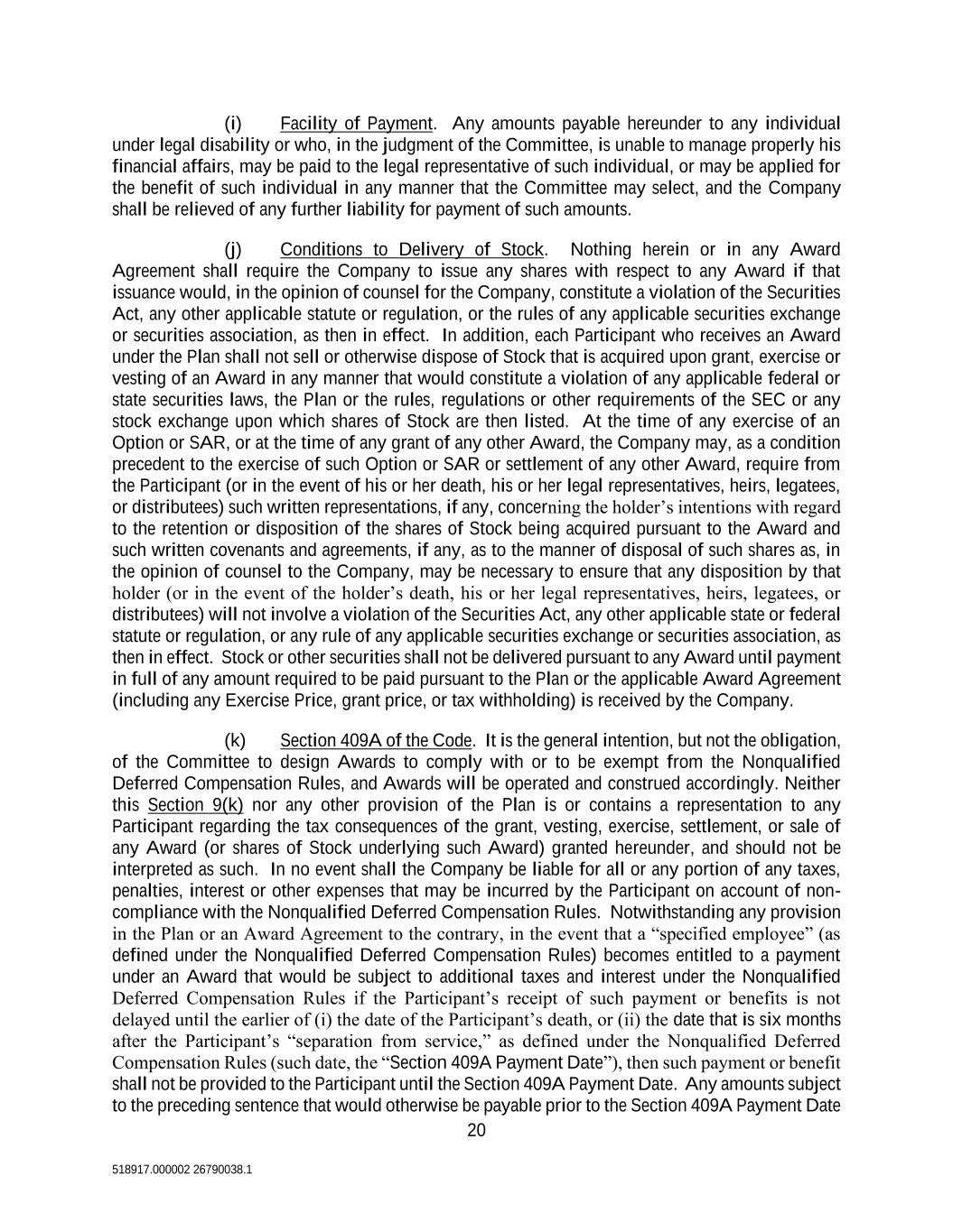 20 518917.000002 26790038.1 (i) Facility of Payment. Any amounts payable hereunder to any individual under legal disability or who, in the judgment of the Committee, is unable to manage properly his financial affairs, may be paid to the legal representative of such individual, or may be applied for the benefit of such individual in any manner that the Committee may select, and the Company shall be relieved of any further liability for payment of such amounts. (j) Conditions to Delivery of Stock. Nothing herein or in any Award Agreement shall require the Company to issue any shares with respect to any Award if that issuance would, in the opinion of counsel for the Company, constitute a violation of the Securities Act, any other applicable statute or regulation, or the rules of any applicable securities exchange or securities association, as then in effect. In addition, each Participant who receives an Award under the Plan shall not sell or otherwise dispose of Stock that is acquired upon grant, exercise or vesting of an Award in any manner that would constitute a violation of any applicable federal or state securities laws, the Plan or the rules, regulations or other requirements of the SEC or any stock exchange upon which shares of Stock are then listed. At the time of any exercise of an Option or SAR, or at the time of any grant of any other Award, the Company may, as a condition precedent to the exercise of such Option or SAR or settlement of any other Award, require from the Participant (or in the event of his or her death, his or her legal representatives, heirs, legatees, or distributees) such written representations, if any, concerning the holder’s intentions with regard to the retention or disposition of the shares of Stock being acquired pursuant to the Award and such written covenants and agreements, if any, as to the manner of disposal of such shares as, in the opinion of counsel to the Company, may be necessary to ensure that any disposition by that holder (or in the event of the holder’s death, his or her legal representatives, heirs, legatees, or distributees) will not involve a violation of the Securities Act, any other applicable state or federal statute or regulation, or any rule of any applicable securities exchange or securities association, as then in effect. Stock or other securities shall not be delivered pursuant to any Award until payment in full of any amount required to be paid pursuant to the Plan or the applicable Award Agreement (including any Exercise Price, grant price, or tax withholding) is received by the Company. (k) Section 409A of the Code. It is the general intention, but not the obligation, of the Committee to design Awards to comply with or to be exempt from the Nonqualified Deferred Compensation Rules, and Awards will be operated and construed accordingly. Neither this Section 9(k) nor any other provision of the Plan is or contains a representation to any Participant regarding the tax consequences of the grant, vesting, exercise, settlement, or sale of any Award (or shares of Stock underlying such Award) granted hereunder, and should not be interpreted as such. In no event shall the Company be liable for all or any portion of any taxes, penalties, interest or other expenses that may be incurred by the Participant on account of non- compliance with the Nonqualified Deferred Compensation Rules. Notwithstanding any provision in the Plan or an Award Agreement to the contrary, in the event that a “specified employee” (as defined under the Nonqualified Deferred Compensation Rules) becomes entitled to a payment under an Award that would be subject to additional taxes and interest under the Nonqualified Deferred Compensation Rules if the Participant’s receipt of such payment or benefits is not delayed until the earlier of (i) the date of the Participant’s death, or (ii) the date that is six months after the Participant’s “separation from service,” as defined under the Nonqualified Deferred Compensation Rules (such date, the “Section 409A Payment Date”), then such payment or benefit shall not be provided to the Participant until the Section 409A Payment Date. Any amounts subject to the preceding sentence that would otherwise be payable prior to the Section 409A Payment Date