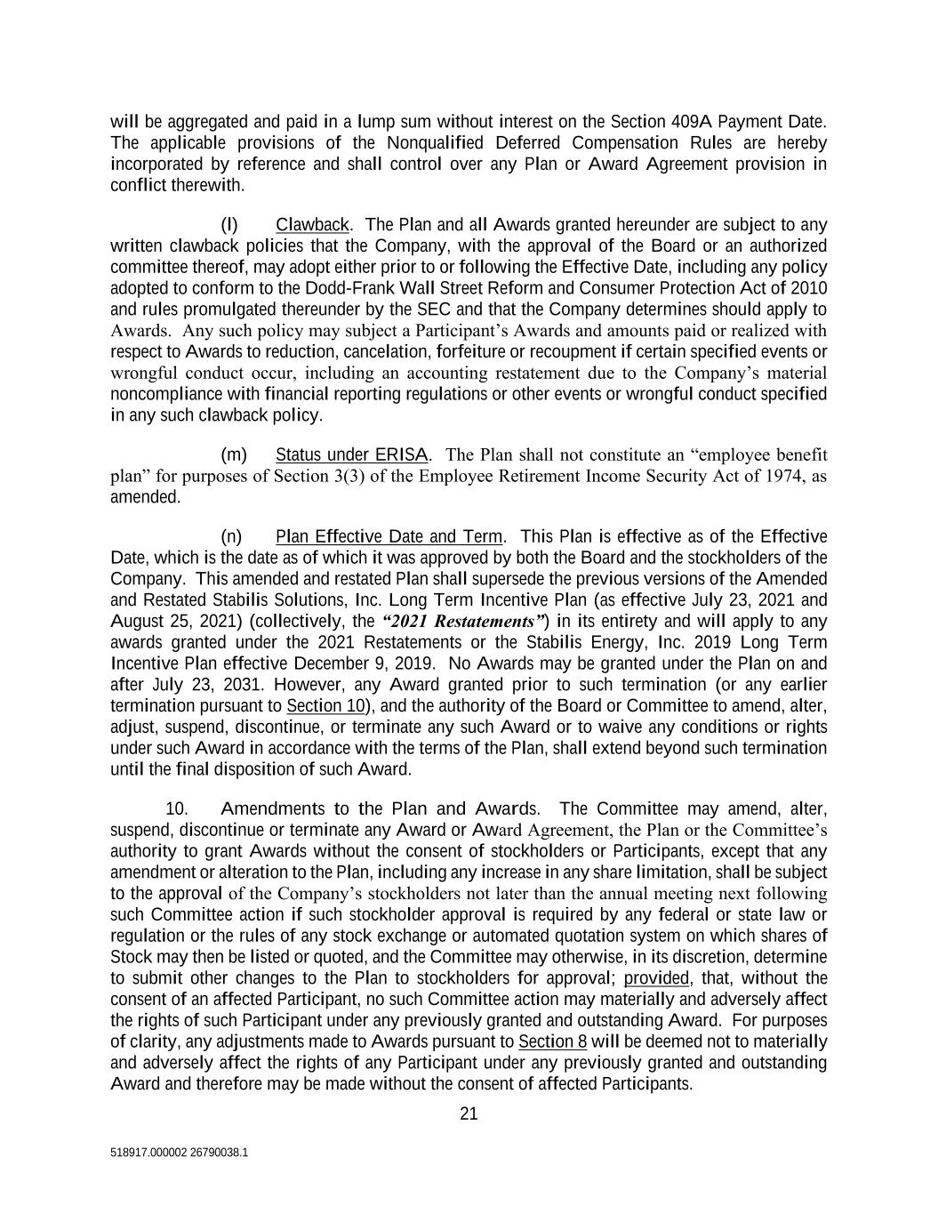 21 518917.000002 26790038.1 will be aggregated and paid in a lump sum without interest on the Section 409A Payment Date. The applicable provisions of the Nonqualified Deferred Compensation Rules are hereby incorporated by reference and shall control over any Plan or Award Agreement provision in conflict therewith. (l) Clawback. The Plan and all Awards granted hereunder are subject to any written clawback policies that the Company, with the approval of the Board or an authorized committee thereof, may adopt either prior to or following the Effective Date, including any policy adopted to conform to the Dodd-Frank Wall Street Reform and Consumer Protection Act of 2010 and rules promulgated thereunder by the SEC and that the Company determines should apply to Awards. Any such policy may subject a Participant’s Awards and amounts paid or realized with respect to Awards to reduction, cancelation, forfeiture or recoupment if certain specified events or wrongful conduct occur, including an accounting restatement due to the Company’s material noncompliance with financial reporting regulations or other events or wrongful conduct specified in any such clawback policy. (m) Status under ERISA. The Plan shall not constitute an “employee benefit plan” for purposes of Section 3(3) of the Employee Retirement Income Security Act of 1974, as amended. (n) Plan Effective Date and Term. This Plan is effective as of the Effective Date, which is the date as of which it was approved by both the Board and the stockholders of the Company. This amended and restated Plan shall supersede the previous versions of the Amended and Restated Stabilis Solutions, Inc. Long Term Incentive Plan (as effective July 23, 2021 and August 25, 2021) (collectively, the “2021 Restatements”) in its entirety and will apply to any awards granted under the 2021 Restatements or the Stabilis Energy, Inc. 2019 Long Term Incentive Plan effective December 9, 2019. No Awards may be granted under the Plan on and after July 23, 2031. However, any Award granted prior to such termination (or any earlier termination pursuant to Section 10), and the authority of the Board or Committee to amend, alter, adjust, suspend, discontinue, or terminate any such Award or to waive any conditions or rights under such Award in accordance with the terms of the Plan, shall extend beyond such termination until the final disposition of such Award. 10. Amendments to the Plan and Awards. The Committee may amend, alter, suspend, discontinue or terminate any Award or Award Agreement, the Plan or the Committee’s authority to grant Awards without the consent of stockholders or Participants, except that any amendment or alteration to the Plan, including any increase in any share limitation, shall be subject to the approval of the Company’s stockholders not later than the annual meeting next following such Committee action if such stockholder approval is required by any federal or state law or regulation or the rules of any stock exchange or automated quotation system on which shares of Stock may then be listed or quoted, and the Committee may otherwise, in its discretion, determine to submit other changes to the Plan to stockholders for approval; provided, that, without the consent of an affected Participant, no such Committee action may materially and adversely affect the rights of such Participant under any previously granted and outstanding Award. For purposes of clarity, any adjustments made to Awards pursuant to Section 8 will be deemed not to materially and adversely affect the rights of any Participant under any previously granted and outstanding Award and therefore may be made without the consent of affected Participants.
