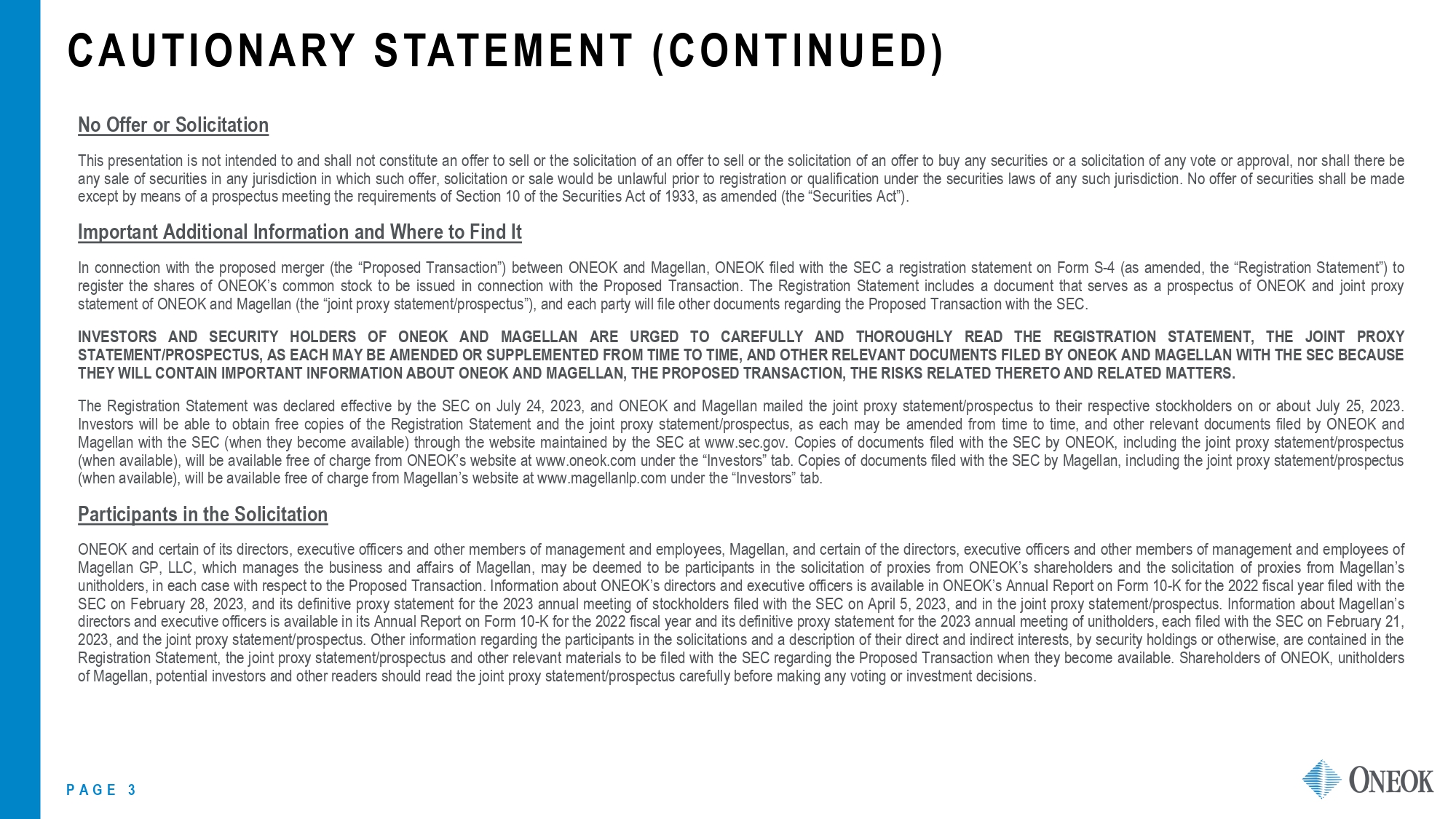 PAGE 2 CAUTIONARY STATEMENT Forward - Looking Statements This presentation contains “forward - looking statements” within the meaning of Section 27 A of the Securities Act and Section 21 E of the Securities Exchange Act of 1934 , as amended . All statements, other than statements of historical fact, included in this communication that address activities, events or developments that ONEOK or Magellan expects, believes or anticipates will or may occur in the future are forward - looking statements . Words such as “estimate,” “project,” “predict,” “believe,” “expect,” “anticipate,” “potential,” “create,” “intend,” “could,” “would,” “may,” “plan,” “will,” “guidance,” “look,” “goal,” “future,” “build,” “focus,” “continue,” “strive,” “allow” or the negative of such terms or other variations thereof and words and terms of similar substance used in connection with any discussion of future plans, actions, or events identify forward - looking statements . However, the absence of these words does not mean that the statements are not forward - looking . These forward - looking statements include, but are not limited to, statements regarding the Proposed Transaction, the expected closing of the Proposed Transaction and the timing thereof and as adjusted descriptions of the post - Transaction company and its operations, strategies and plans, integration, debt levels and leverage ratio, capital expenditures, cash flows and anticipated uses thereof, synergies, opportunities and anticipated future performance, including maintaining current ONEOK management, enhancements to investment - grade credit profile, an expected accretion to earnings and free cash flow, dividend payments and potential share repurchases, increase in value of tax attributes and expected impact on EBITDA . Information adjusted for the Proposed Transaction should not be considered a forecast of future results . There are a number of risks and uncertainties that could cause actual results to differ materially from the forward - looking statements included in this communication . These include the risk that ONEOK’s and Magellan’s businesses will not be integrated successfully; the risk that cost savings, synergies and growth from the Proposed Transaction may not be fully realized or may take longer to realize than expected; the risk that the credit ratings of the combined company or its subsidiaries may be different from what the companies expect; the possibility that shareholders of ONEOK may not approve the issuance of new shares of ONEOK common stock in the Proposed Transaction or that shareholders of ONEOK or unitholders of Magellan may not approve the Proposed Transaction; the risk that a condition to closing of the Proposed Transaction may not be satisfied, that either party may terminate the Merger Agreement or that the closing of the Proposed Transaction might be delayed or not occur at all; potential adverse reactions or changes to business or employee relationships, including those resulting from the announcement or completion of the Proposed Transaction; the parties do not receive regulatory approval of the Proposed Transaction; the occurrence of any other event, change or other circumstances that could give rise to the termination of the Merger Agreement relating to the Proposed Transaction; the risk that ONEOK may not be able to secure the debt financing necessary to fund the cash consideration required for the Proposed Transaction; the risk that changes in ONEOK’s capital structure and governance could have adverse effects on the market value of its securities; the ability of ONEOK and Magellan to retain customers and retain and hire key personnel and maintain relationships with their suppliers and customers and on ONEOK’s and Magellan’s operating results and business generally; the risk the Proposed Transaction could distract management from ongoing business operations or cause ONEOK and/or Magellan to incur substantial costs; the risk that ONEOK may be unable to reduce expenses or access financing or liquidity; the impact of the COVID - 19 pandemic, any related economic downturn and any related substantial decline in commodity prices; the risk of changes in governmental regulations or enforcement practices, especially with respect to environmental, health and safety matters; and other important factors that could cause actual results to differ materially from those projected . All such factors are difficult to predict and are beyond ONEOK’s or Magellan’s control, including those detailed in ONEOK’s Annual Reports on Form 10 - K, Quarterly Reports on Form 10 - Q and Current Reports on Form 8 - K that are available on ONEOK’s website at www . oneok . com and on the website of the SEC at www . sec . gov, and those detailed in Magellan’s Annual Reports on Form 10 - K, Quarterly Reports on Form 10 - Q and Current Reports on Form 8 - K that are available on Magellan’s website at www . magellanlp . com and on the website of the SEC . All forward - looking statements are based on assumptions that ONEOK and Magellan believe to be reasonable but that may not prove to be accurate . Any forward - looking statement speaks only as of the date on which such statement is made, and neither ONEOK nor Magellan undertakes any obligation to correct or update any forward - looking statement, whether as a result of new information, future events or otherwise, except as required by applicable law . Readers are cautioned not to place undue reliance on these forward - looking statements, which speak only as of the date hereof . All references in this presentation to financial guidance are based on the news releases issued on Feb . 27 , 2023 , May 2 , 2023 and Aug . 7 , 2023 , and are not being updated or affirmed by this presentation . Non - GAAP Financial Measures This presentation contains references to certain non - GAAP financ