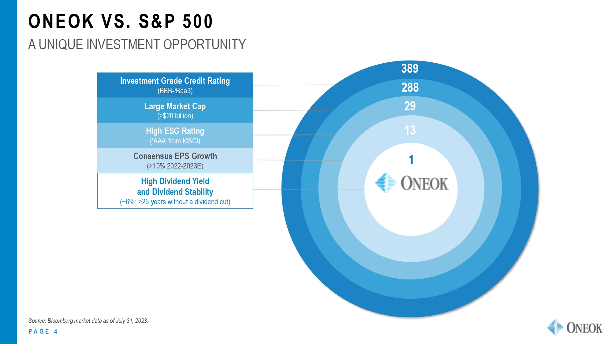 PAGE 3 CAUTIONARY STATEMENT (CONTINUED) No Offer or Solicitation This presentation is not intended to and shall not constitute an offer to sell or the solicitation of an offer to sell or the solicitation of an offer to buy any securities or a solicitation of any vote or approval, nor shall there be any sale of securities in any jurisdiction in which such offer, solicitation or sale would be unlawful prior to registration or qualification under the securities laws of any such jurisdiction . No offer of securities shall be made except by means of a prospectus meeting the requirements of Section 10 of the Securities Act of 1933 , as amended (the “Securities Act”) . Important Additional Information and Where to Find It In connection with the proposed merger (the “Proposed Transaction”) between ONEOK and Magellan, ONEOK filed with the SEC a registration statement on Form S - 4 (as amended, the “Registration Statement”) to register the shares of ONEOK’s common stock to be issued in connection with the Proposed Transaction . The Registration Statement includes a document that serves as a prospectus of ONEOK and joint proxy statement of ONEOK and Magellan (the “joint proxy statement/prospectus”), and each party will file other documents regarding the Proposed Transaction with the SEC . INVESTORS AND SECURITY HOLDERS OF ONEOK AND MAGELLAN ARE URGED TO CAREFULLY AND THOROUGHLY READ THE REGISTRATION STATEMENT, THE JOINT PROXY STATEMENT/PROSPECTUS, AS EACH MAY BE AMENDED OR SUPPLEMENTED FROM TIME TO TIME, AND OTHER RELEVANT DOCUMENTS FILED BY ONEOK AND MAGELLAN WITH THE SEC BECAUSE THEY WILL CONTAIN IMPORTANT INFORMATION ABOUT ONEOK AND MAGELLAN, THE PROPOSED TRANSACTION, THE RISKS RELATED THERETO AND RELATED MATTERS . The Registration Statement was declared effective by the SEC on July 24 , 2023 , and ONEOK and Magellan mailed the joint proxy statement/prospectus to their respective stockholders on or about July 25 , 2023 . Investors will be able to obtain free copies of the Registration Statement and the joint proxy statement/prospectus, as each may be amended from time to time, and other relevant documents filed by ONEOK and Magellan with the SEC (when they become available) through the website maintained by the SEC at www . sec . gov . Copies of documents filed with the SEC by ONEOK, including the joint proxy statement/prospectus (when available), will be available free of charge from ONEOK’s website at www . oneok . com under the “Investors” tab . Copies of documents filed with the SEC by Magellan, including the joint proxy statement/prospectus (when available), will be available free of charge from Magellan’s website at www . magellanlp . com under the “Investors” tab . Participants in the Solicitation ONEOK and certain of its directors, executive officers and other members of management and employees, Magellan, and certain of the directors, executive officers and other members of management and employees of Magellan GP, LLC, which manages the business and affairs of Magellan, may be deemed to be participants in the solicitation of proxies from ONEOK’s shareholders and the solicitation of proxies from Magellan’s unitholders, in each case with respect to the Proposed Transaction . Information about ONEOK’s directors and executive officers is available in ONEOK’s Annual Report on Form 10 - K for the 2022 fiscal year filed with the SEC on February 28 , 2023 , and its definitive proxy statement for the 2023 annual meeting of stockholders filed with the SEC on April 5 , 2023 , and in the joint proxy statement/prospectus . Information about Magellan’s directors and executive officers is available in its Annual Report on Form 10 - K for the 2022 fiscal year and its definitive proxy statement for the 2023 annual meeting of unitholders, each filed with the SEC on February 21 , 2023 , and the joint proxy statement/prospectus . Other information regarding the participants in the solicitations and a description of their direct and indirect interests, by security holdings or otherwise, are contained in the Registration Statement, the joint proxy statement/prospectus and other relevant materials to be filed with the SEC regarding the Proposed Transaction when they become available . Shareholders of ONEOK, unitholders of Magellan, potential investors and other readers should read the joint proxy statement/prospectus carefully before making any voting or investment decisions .