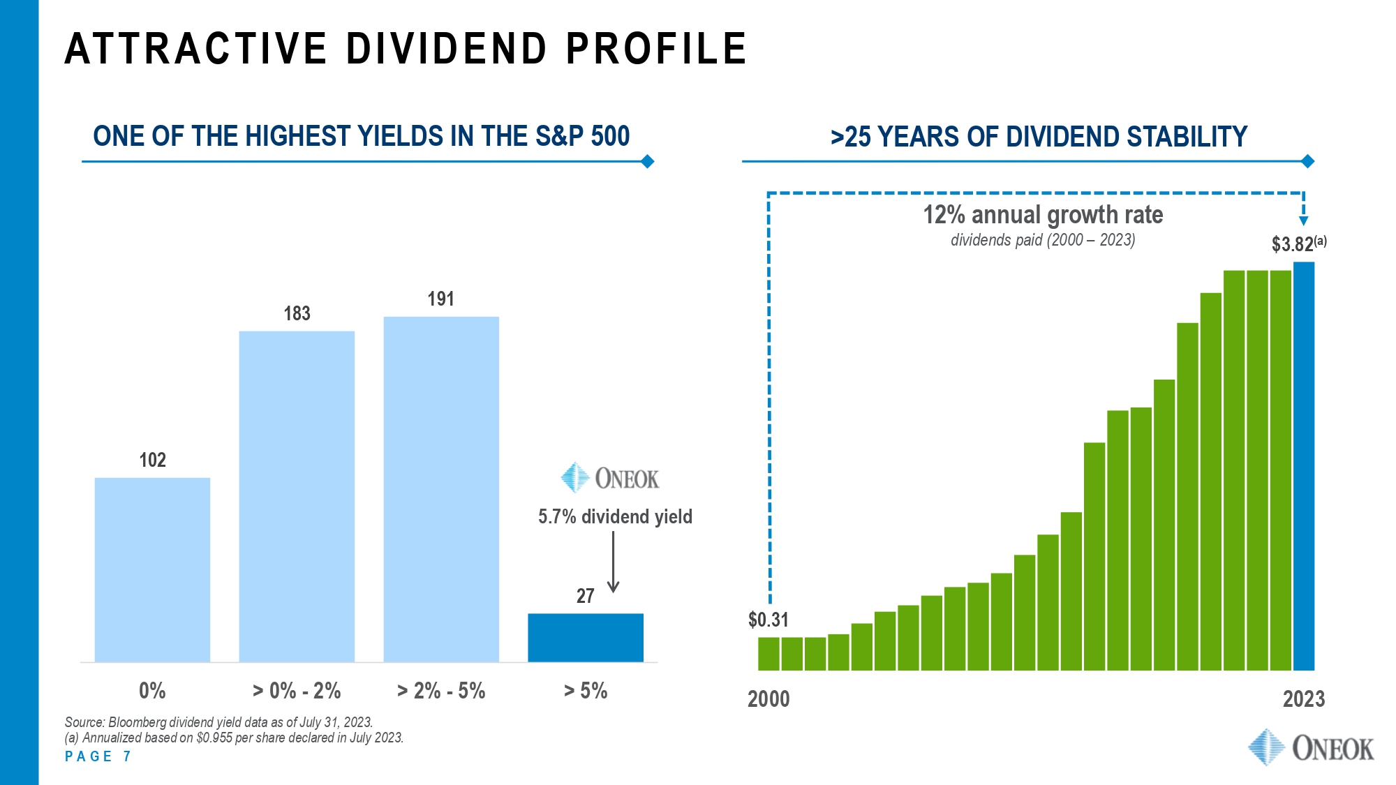 PAGE 4 ONEOK VS. S&P 500 Source: Bloomberg market data as of July 31, 2023. A UNIQUE INVESTMENT OPPORTUNITY 389 288 29 13 1 Investment Grade Credit Rating (BBB - /Baa3) Large Market Cap (>$20 billion) High ESG Rating (‘AAA’ from MSCI) Consensus EPS Growth (>10% 2022 - 2023E) High Dividend Yield and Dividend Stability (~6%; >25 years without a dividend cut)