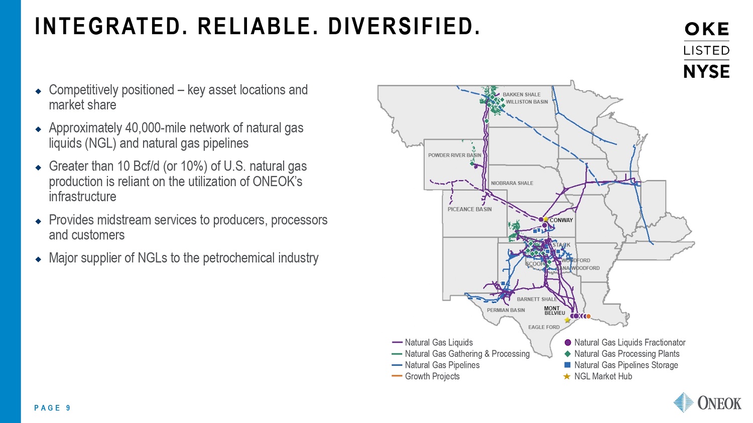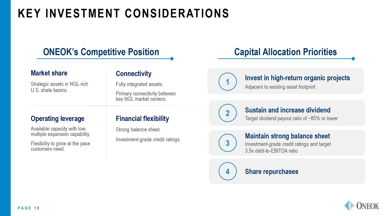 PAGE 9 ◆ Competitively positioned – key asset locations and market share ◆ Approximately 40,000 - mile network of natural gas liquids (NGL) and natural gas pipelines ◆ Greater than 10 Bcf/d (or 10%) of U.S. natural gas production is reliant on the utilization of ONEOK’s infrastructure ◆ Provides midstream services to producers, processors and customers ◆ Major supplier of NGLs to the petrochemical industry INTEGRATED. RELIABLE. DIVERSIFIED. Natural Gas Liquids Natural Gas Liquids Fractionator Natural Gas Gathering & Processing Natural Gas Processing Plants Natural Gas Pipelines Natural Gas Pipelines Storage Growth Projects NGL Market Hub