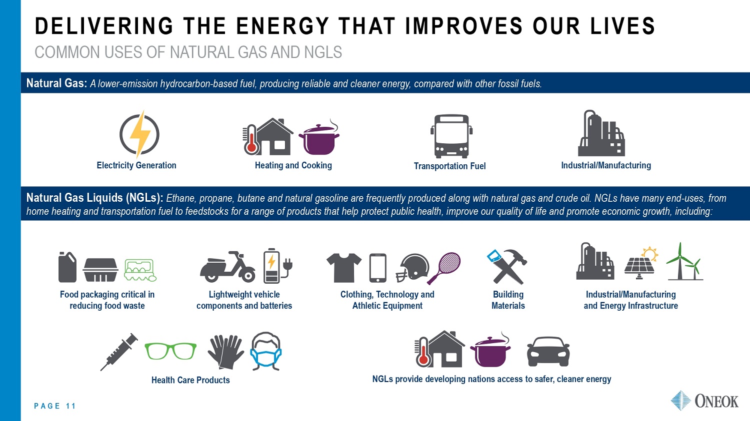 PAGE 10 Market share Strategic assets in NGL - rich U.S. shale basins. KEY INVESTMENT CONSIDERATIONS 1 2 3 4 Invest in high - return organic projects Share repurchases Sustain and increase dividend Adjacent to existing asset footprint Target dividend payout ratio of ~85% or lower Capital Allocation Priorities ONEOK’s Competitive Position Connectivity Fully integrated assets. Primary connectivity between key NGL market centers. Operating leverage Available capacity with low - multiple expansion capability. Flexibility to grow at the pace customers need. Financial flexibility Strong balance sheet. Investment - grade credit ratings. Investment - grade credit ratings and target 3.5x debt - to - EBITDA ratio Maintain strong balance sheet
