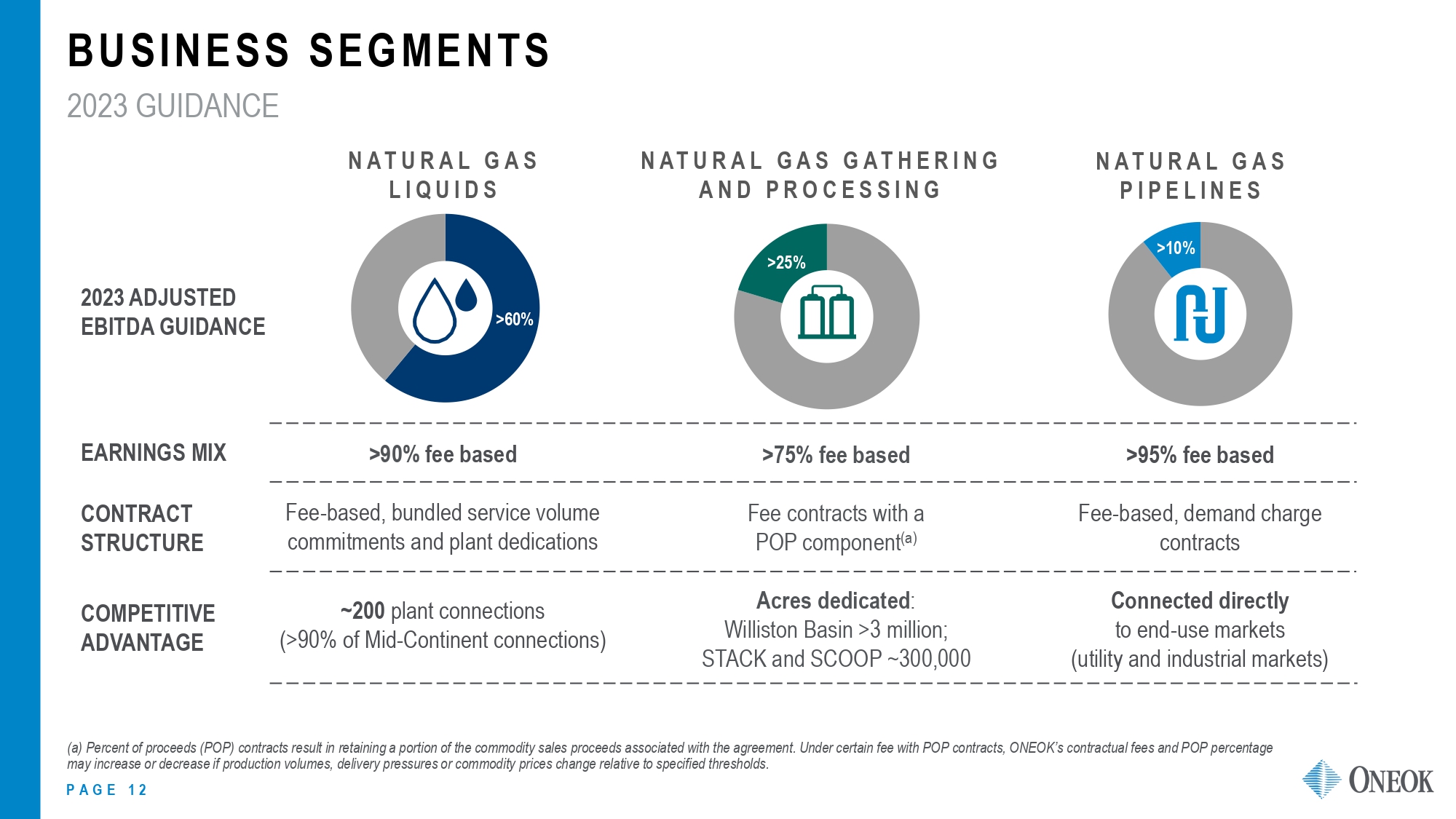 PAGE 12 >60% >10% BUSINESS SEGMENTS (a) Percent of proceeds (POP) contracts result in retaining a portion of the commodity sales proceeds associated with the agr eem ent. Under certain fee with POP contracts, ONEOK’s contractual fees and POP percentage may increase or decrease if production volumes, delivery pressures or commodity prices change relative to specified threshold s. 2023 GUIDANCE >25% NATURAL GAS LIQUIDS NATURAL GAS PIPELINES NATURAL GAS GATHERING AND PROCESSING >90% fee based Fee - based, bundled service volume commitments and plant dedications ~200 plant connections (>90% of Mid - Continent connections) >75% fee based Fee contracts with a POP component (a) Acres dedicated : Williston Basin >3 million; STACK and SCOOP ~300,000 >95% fee based Fee - based, demand charge contracts Connected directly to end - use markets (utility and industrial markets) EARNINGS MIX CONTRACT STRUCTURE COMPETITIVE ADVANTAGE 2023 ADJUSTED EBITDA GUIDANCE