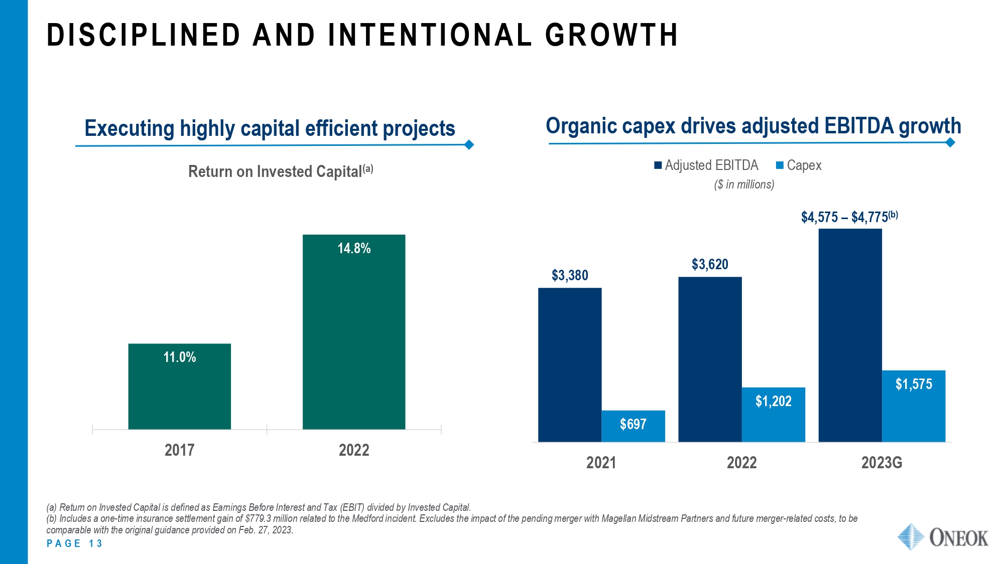 PAGE 13 $3,380 $3,620 $697 $1,202 $1,575 2021 2022 2023G Adjusted EBITDA Capex DISCIPLINED AND INTENTIONAL GROWTH . (a) Return on Invested Capital is defined as Earnings Before Interest and Tax (EBIT) divided by Invested Capital. (b) Includes a one - time insurance settlement gain of $779.3 million related to the Medford incident. Excludes the impact of the pend ing merger with Magellan Midstream Partners and future merger - related costs, to be comparable with the original guidance provided on Feb. 27, 2023. Executing highly capital efficient projects 11.0% 14.8% 2017 2022 Return on Invested Capital (a) Organic capex drives adjusted EBITDA growth ($ in millions) $4,575 – $4,775 (b)