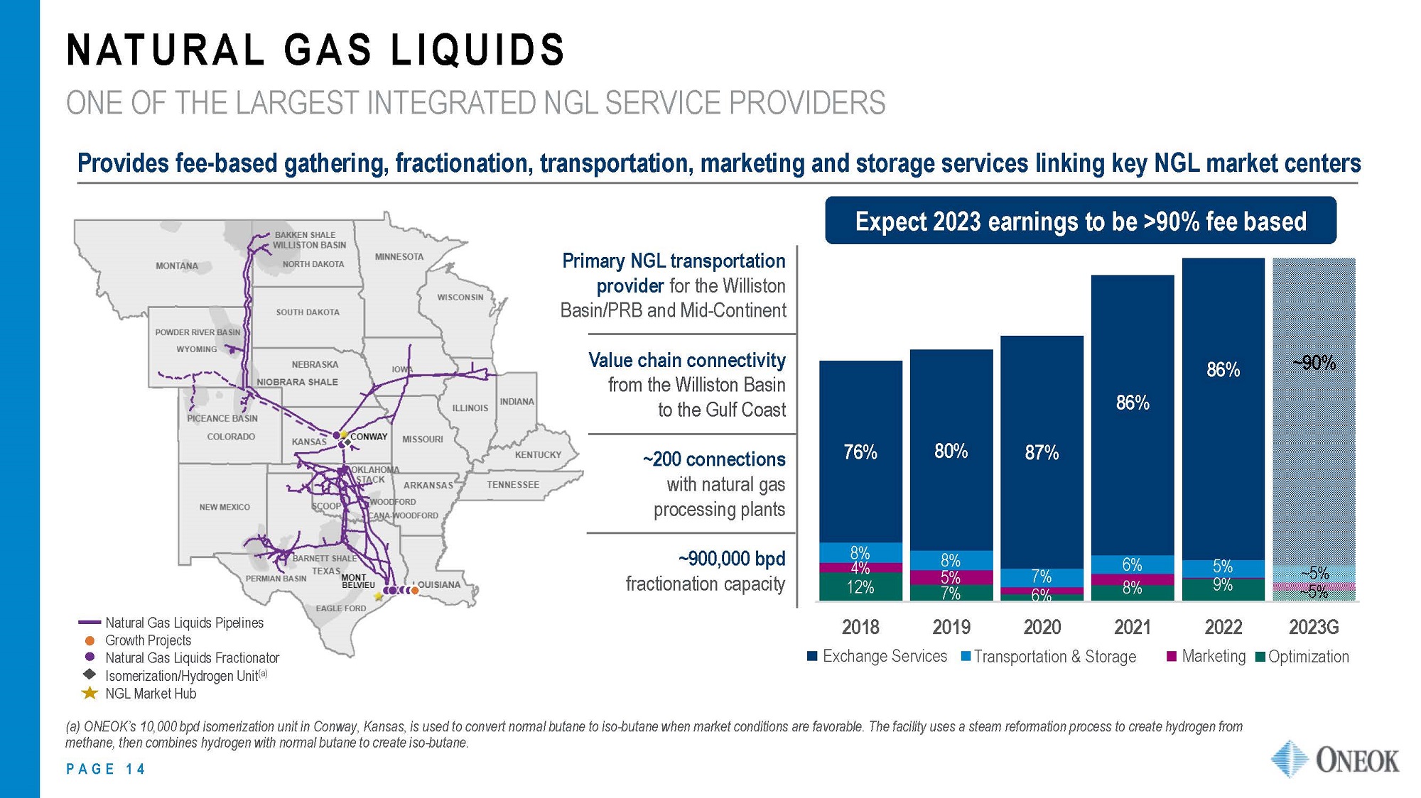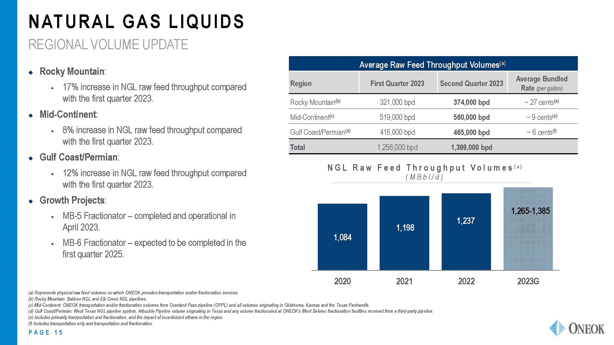 PAGE 14 12% 7% 6% 8% 9% 4% 5% 8% 8% 7% 6% 5% ~5% 76% 80% 87% 86% 86% ~90% 2018 2019 2020 2021 2022 2023G Provides fee - based gathering, fractionation, transportation, marketing and storage services linking key NGL market centers NATURAL GAS LIQUIDS ONE OF THE LARGEST INTEGRATED NGL SERVICE PROVIDERS Primary NGL transportation provider for the Williston Basin/PRB and Mid - Continent Value chain connectivity from the Williston Basin to the Gulf Coast ~200 connections with natural gas processing plants ~900,000 bpd f ractionation capacity Optimization Marketing Transportation & Storage Exchange Services ~5% Expect 2023 earnings to be >90% fee based Natural Gas Liquids Pipelines Growth Projects Natural Gas Liquids Fractionator Isomerization/Hydrogen Unit (a) NGL Market Hub (a) ONEOK’s 10,000 bpd isomerization unit in Conway, Kansas, is used to convert normal butane to iso - butane when market conditions a re favorable. The facility uses a steam reformation process to create hydrogen from methane, then combines hydrogen with normal butane to create iso - butane.
