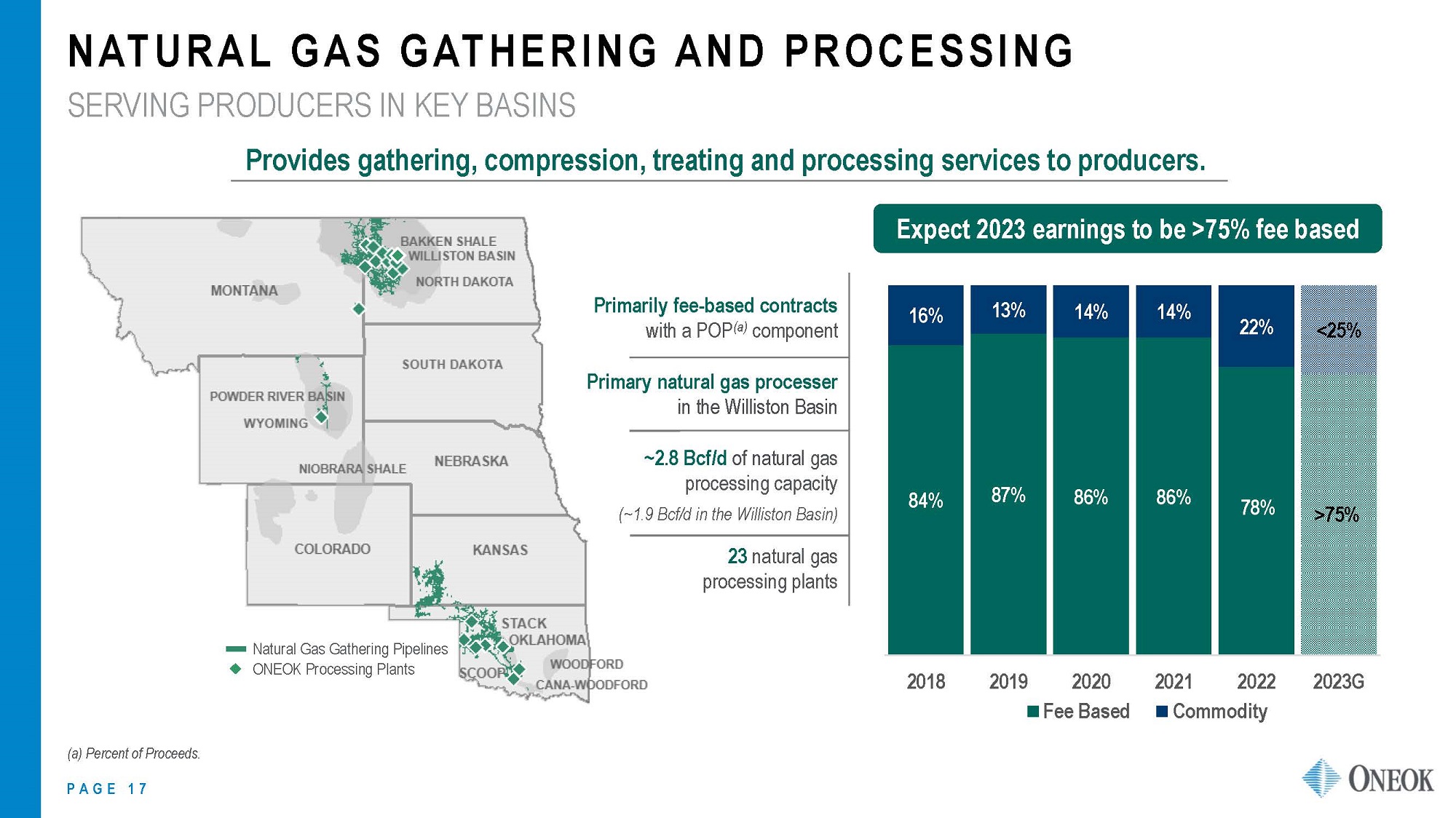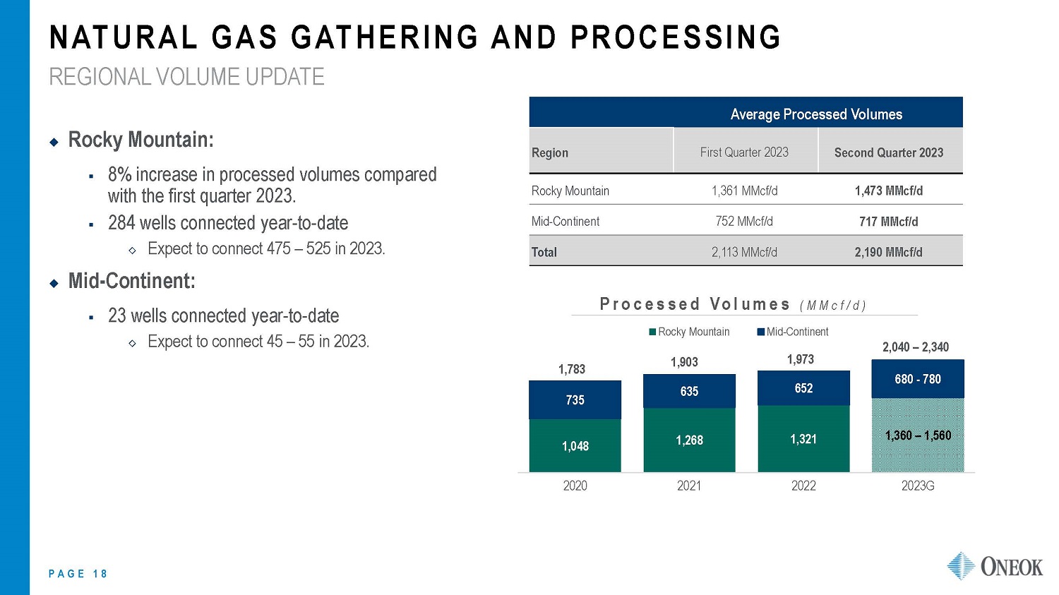 PAGE 17 Primarily fee - based contracts with a POP (a) component Primary natural gas processer in the Williston Basin ~2.8 Bcf /d of natural gas processing capacity (~ 1.9 Bcf /d in the Williston Basin) 23 natural gas processing plants Provides gathering, compression, treating and processing services to producers. NATURAL GAS GATHERING AND PROCESSING SERVING PRODUCERS IN KEY BASINS (a) Percent of Proceeds. 84% 87% 86% 86% 78% >75% 16% 13% 14% 14% 22% <25% 2018 2019 2020 2021 2022 2023G Fee Based Commodity Expect 2023 earnings to be >75% fee based Natural Gas Gathering Pipelines ONEOK Processing Plants