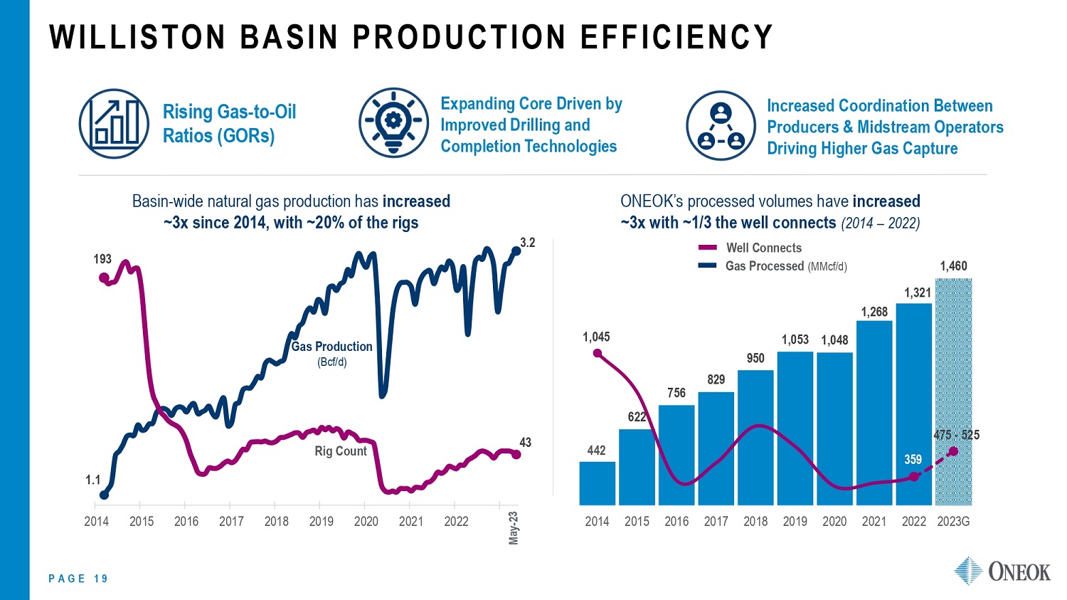 PAGE 19 1.1 3.2 193 43 0 50 100 150 200 250 1.0 1.5 2.0 2.5 3.0 3.5 2014 2015 2016 2017 2018 2019 2020 2021 2022 2023 WILLISTON BASIN PRODUCTION EFFICIENCY 442 622 756 829 950 1,053 1,048 1,268 1,321 1,460 1,045 359 475 - 525 2014 2015 2016 2017 2018 2019 2020 2021 2022 2023G Well Connects Gas Processed ( MMcf /d) ONEOK’s processed volumes have increased ~ 3x with ~1/3 the well connects (2014 – 2022) Rising Gas - to - Oil Ratios (GORs) Expanding Core Driven by Improved Drilling and Completion Technologies Increased Coordination Between Producers & Midstream Operators Driving Higher Gas Capture Rig Count Gas Production ( Bcf /d) Basin - wide natural gas production has increased ~3x since 2014, with ~20 % of the rigs May - 23