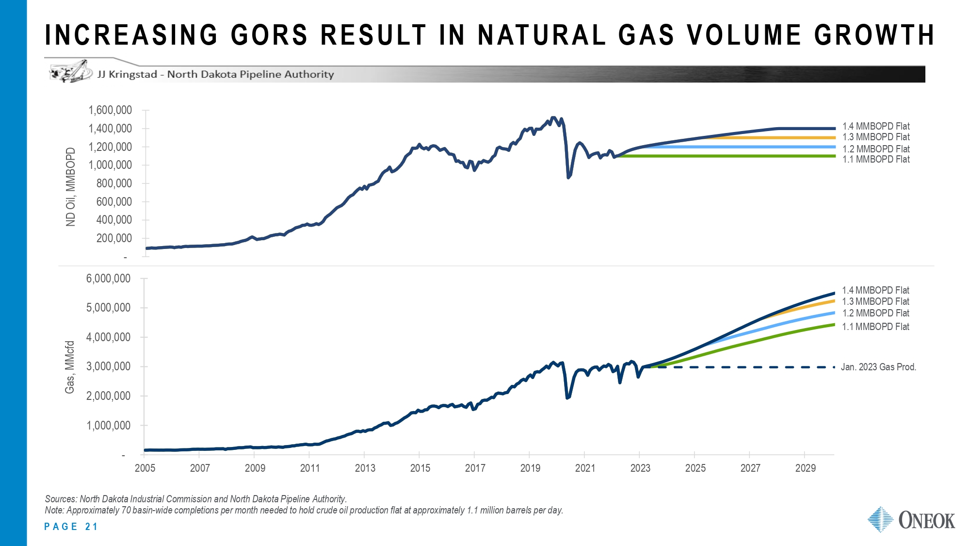 PAGE 20 1.46 1.79 2.04 2.78 1.00 1.50 2.00 2.50 3.00 - 500 1,000 1,500 2,000 2,500 3,000 3,500 2016 2017 2018 2019 2020 2021 2022 2023 Gas Produced (MMcf/d) Oil Produced (MBbl/d) GOR WILLISTON BASIN PRODUCTION RISING GAS - TO - OIL RATIOS (GORS) AND GAS CAPTURE PRESENT OPPORTUN ITIES Williston Basin GORs have increased ~90% since 2016. - 500 1,000 1,500 2,000 2,500 3,000 3,500 2016 2017 2018 2019 2020 2021 2022 2023 Gas Produced (MMcf/d) Gas Flared (MMcf/d) • Statewide flaring: ~150 MMcf/d • Estimated flaring on ONEOK’s dedicated acreage: ~ 90 MMcf /d Statewide flaring has decreased from 36% in 2014 to ~5% in May 2023. May - 23 May - 23