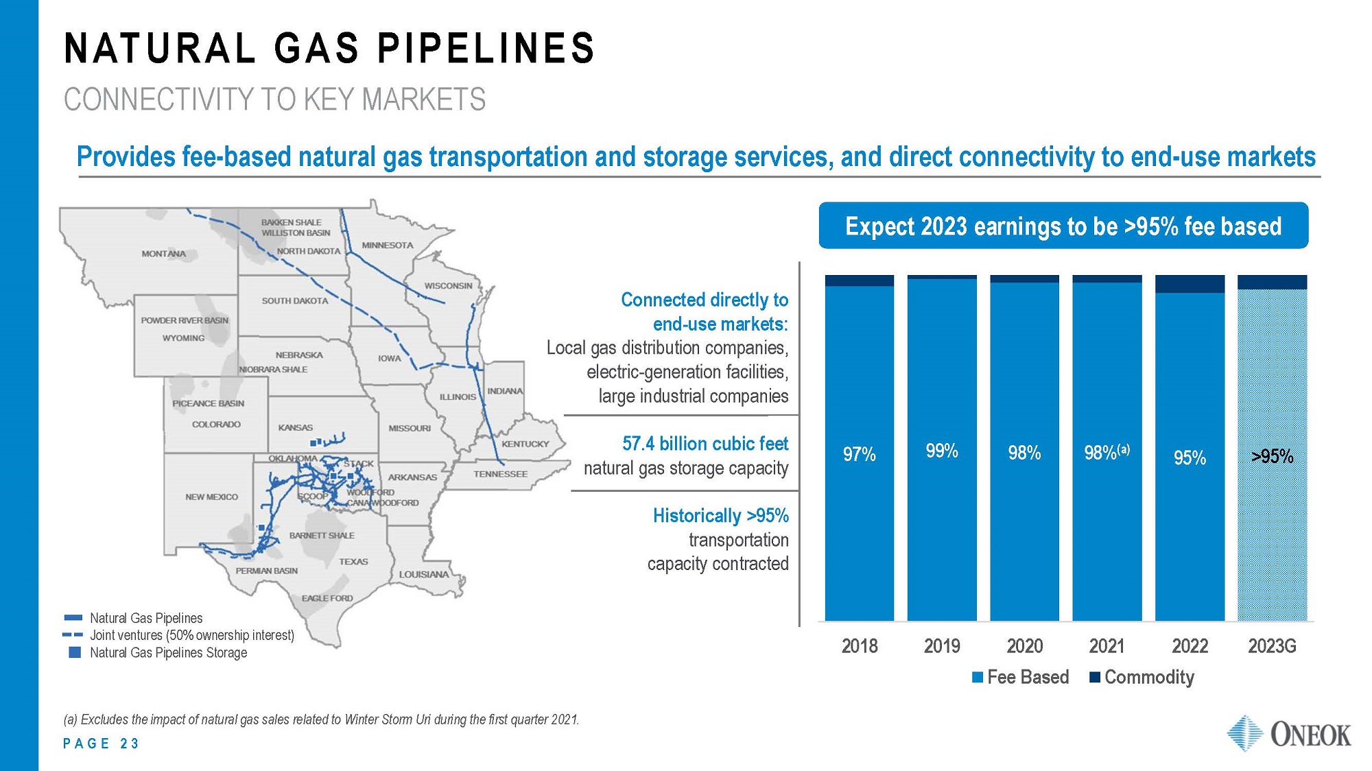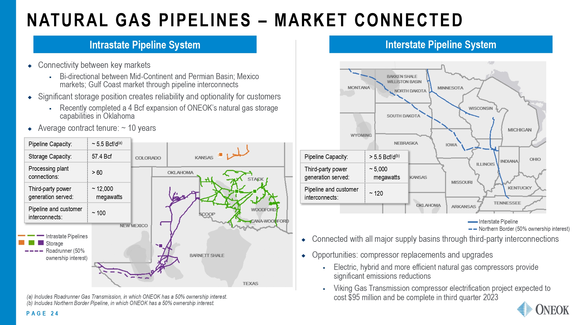 PAGE 23 NATURAL GAS PIPELINES CONNECTIVITY TO KEY MARKETS Provides fee - based natural gas transportation and storage services, and direct connectivity to end - use markets 97% 99% 98% 98% (a) 95% >95% 2018 2019 2020 2021 2022 2023G Fee Based Commodity Connected directly to end - use markets: Local gas distribution companies, electric - generation facilities, large industrial companies 57.4 billion cubic feet natural gas storage capacity Historically >95% transportation capacity contracted Expect 2023 earnings to be > 95 % fee based Natural Gas Pipelines Joint ventures (50% ownership interest) Natural Gas Pipelines Storage (a) Excludes the impact of natural gas sales related to Winter Storm Uri during the first quarter 2021.