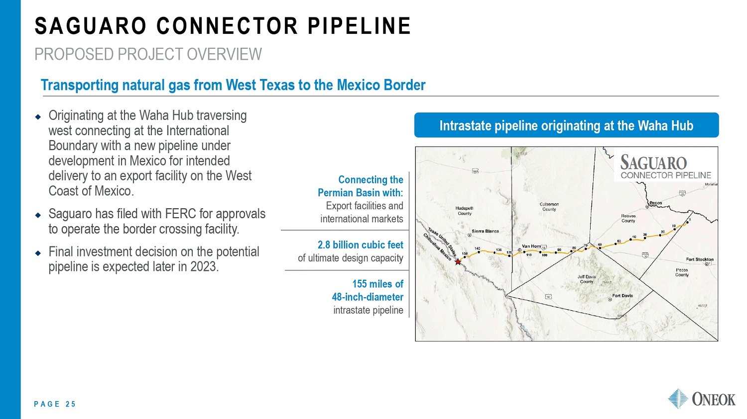 PAGE 24 NATURAL GAS PIPELINES – MARKET CONNECTED (a) Includes Roadrunner Gas Transmission, in which ONEOK has a 50% ownership interest. (b) Includes Northern Border Pipeline, in which ONEOK has a 50% ownership interest. ◆ Connectivity between key markets ▪ Bi - directional between Mid - Continent and Permian Basin; Mexico markets; Gulf Coast market through pipeline interconnects ◆ Significant storage position creates reliability and optionality for customers ▪ Recently completed a 4 Bcf expansion of ONEOK’s natural gas storage capabilities in Oklahoma ◆ Average contract tenure: ~ 10 years Interstate Pipeline System ◆ Connected with all major supply basins through third - party interconnections ◆ Opportunities: compressor replacements and upgrades ▪ Electric, hybrid and more efficient natural gas compressors provide significant emissions reductions ▪ Viking Gas Transmission compressor electrification project expected to cost $95 million and be complete in third quarter 2023 Intrastate Pipeline System > 5.5 Bcf/d (b) Pipeline Capacity: ~ 5,000 megawatts Third - party power generation served: ~ 120 Pipeline and customer interconnects: ~ 5.5 Bcf /d (a) Pipeline Capacity: 57.4 Bcf Storage Capacity: > 60 Processing plant connections: ~ 12,000 megawatts Third - party power generation served: ~ 100 Pipeline and customer interconnects: Interstate Pipeline Northern Border (50% ownership interest) Intrastate Pipelines Storage Roadrunner (50% ownership interest)
