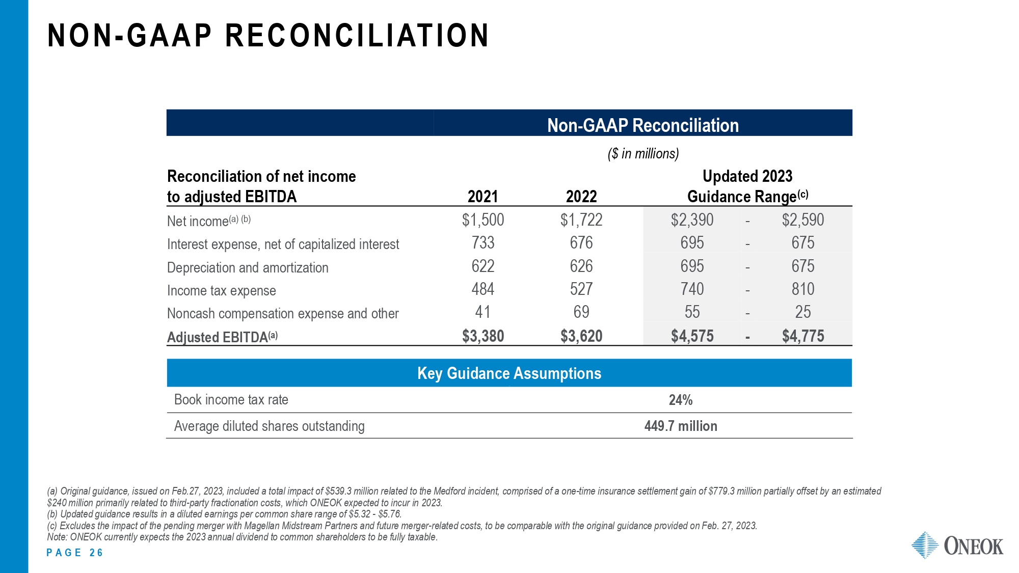 PAGE 26 NON - GAAP RECONCILIATION Key Guidance Assumptions 24% Book income tax rate 449.7 million Average diluted shares outstanding (a) Original guidance, issued on Feb.27, 2023, included a total impact of $539.3 million related to the Medford incident, com pri sed of a one - time insurance settlement gain of $779.3 million partially offset by an estimated $240 million primarily related to third - party fractionation costs, which ONEOK expected to incur in 2023. (b) Updated guidance results in a diluted earnings per common share range of $5.32 - $5.76. (c) Excludes the impact of the pending merger with Magellan Midstream Partners and future merger - related costs, to be comparable with the original guidance provided on Feb. 27, 2023. Note: ONEOK currently expects the 2023 annual dividend to common shareholders to be fully taxable. Non - GAAP Reconciliation ($ in millions) Updated 2023 Guidance Range (c) 2022 2021 Reconciliation of net income to adjusted EBITDA $2,590 - $2,390 $1,722 $1,500 Net income (a) (b) 675 - 695 676 733 Interest expense, net of capitalized interest 675 - 695 626 622 Depreciation and amortization 810 - 740 527 484 Income tax expense 25 - 55 69 41 Noncash compensation expense and other $4,775 - $4,575 $3,620 $3,380 Adjusted EBITDA (a)