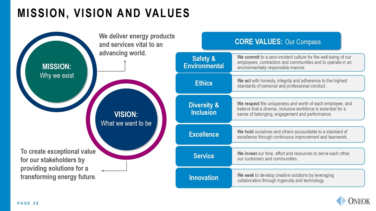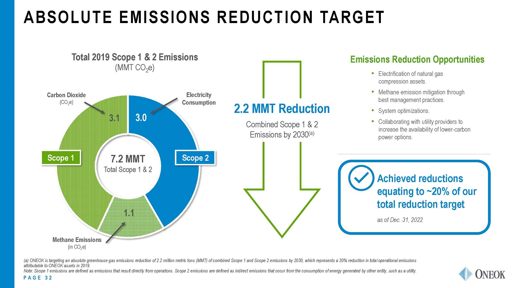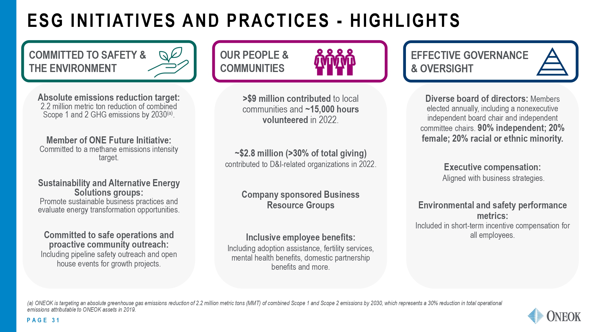 PAGE 31 Diverse board of directors: Members elected annually, including a nonexecutive independent board chair and independent committee chairs. 90% independent; 20% female; 20% racial or ethnic minority. Executive compensation: Aligned with business strategies. Environmental and safety performance metrics: Included in short - term incentive compensation for all employees. ESG INITIATIVES AND PRACTICES - HIGHLIGHTS (a) ONEOK is targeting an absolute greenhouse gas emissions reduction of 2.2 million metric tons (MMT) of combined Scope 1 an d S cope 2 emissions by 2030, which represents a 30% reduction in total operational emissions attributable to ONEOK assets in 2019. >$9 million contributed to local communities and ~15,000 hours volunteered in 2022. ~$2.8 million (>30% of total giving) contributed to D&I - related organizations in 2022. Company sponsored Business Resource Groups Inclusive employee benefits: Including adoption assistance, fertility services, mental health benefits, domestic partnership benefits and more. COMMITTED TO SAFETY & THE ENVIRONMENT Absolute emissions reduction target: 2.2 million metric ton reduction of combined Scope 1 and 2 GHG emissions by 2030 (a) . Member of ONE Future Initiative: Committed to a methane emissions intensity target. Sustainability and Alternative Energy Solutions groups: Promote sustainable business practices and evaluate energy transformation opportunities. Committed to safe operations and proactive community outreach: Including pipeline safety outreach and open house events for growth projects. EFFECTIVE GOVERNANCE & OVERSIGHT OUR PEOPLE & COMMUNITIES