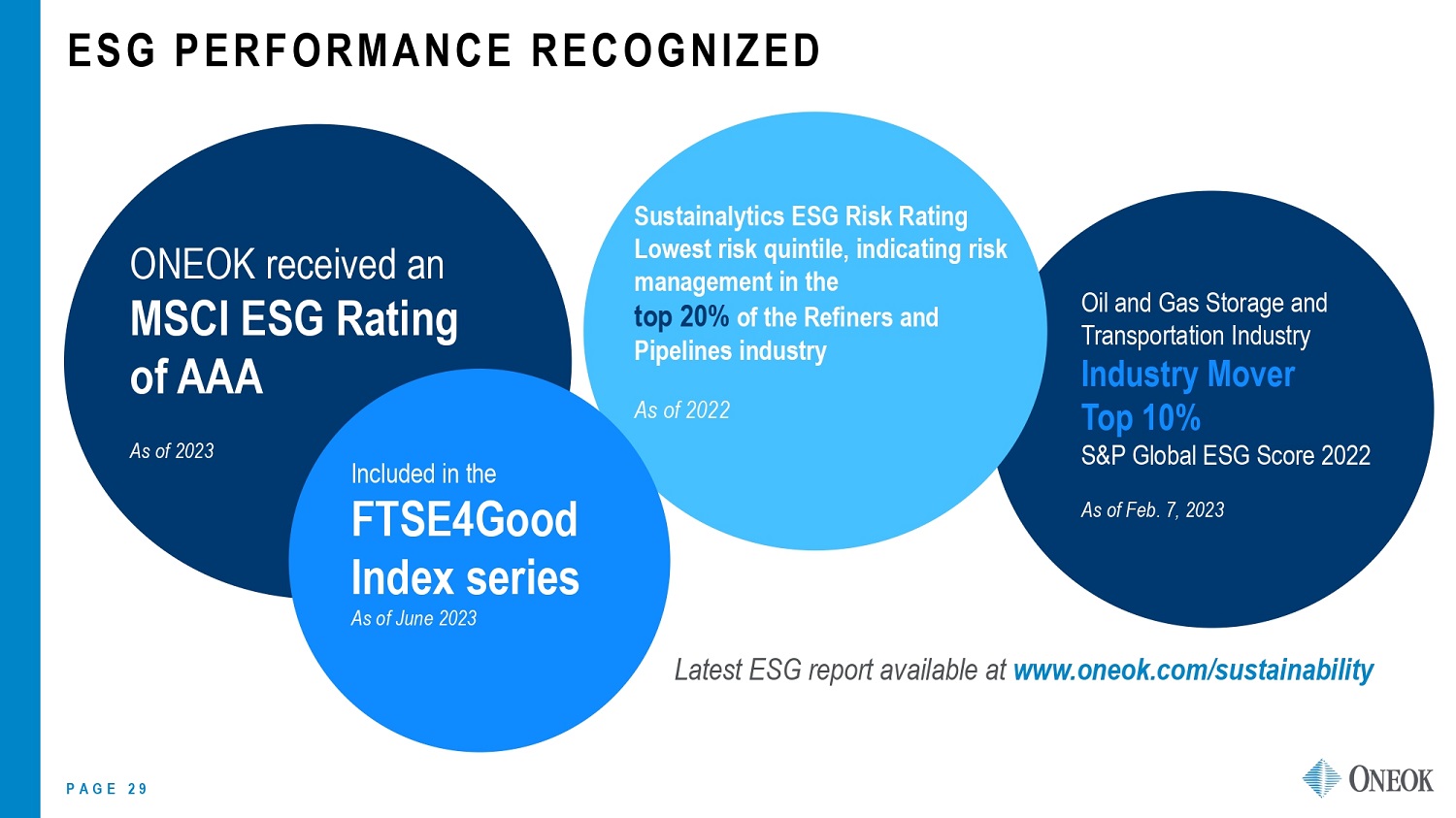PAGE 29 Oil and Gas Storage and Transportation Industry Industry Mover Top 10% S&P Global ESG Score 2022 As of Feb. 7, 2023 ESG PERFORMANCE RECOGNIZED ONEOK received an MSCI ESG Rating of AAA As of 2023 Latest ESG report available at www.oneok.com/sustainability Included in the FTSE4Good Index series As of June 2023 Sustainalytics ESG Risk Rating Lowest risk quintile, indicating risk management in the top 20% of the Refiners and Pipelines industry As of 2022