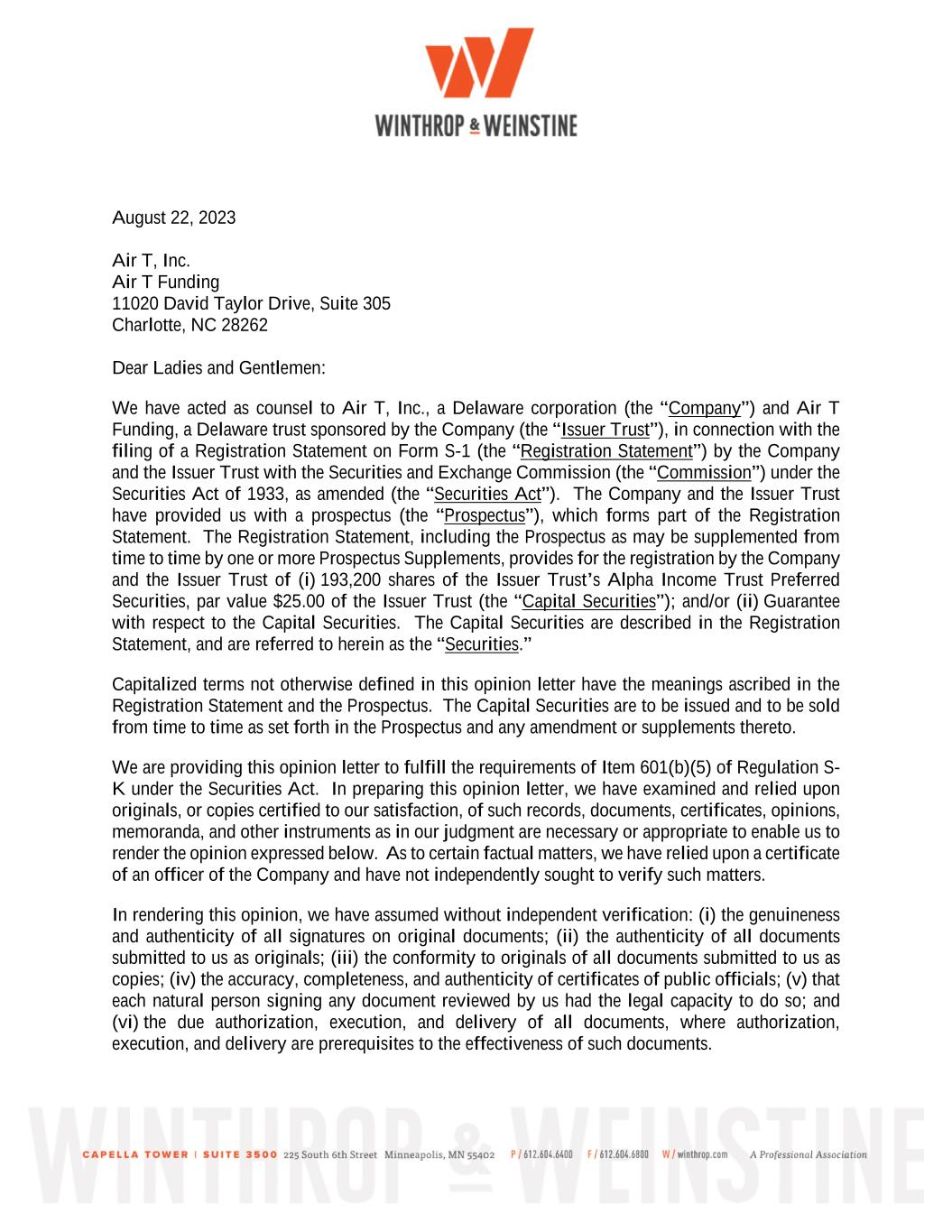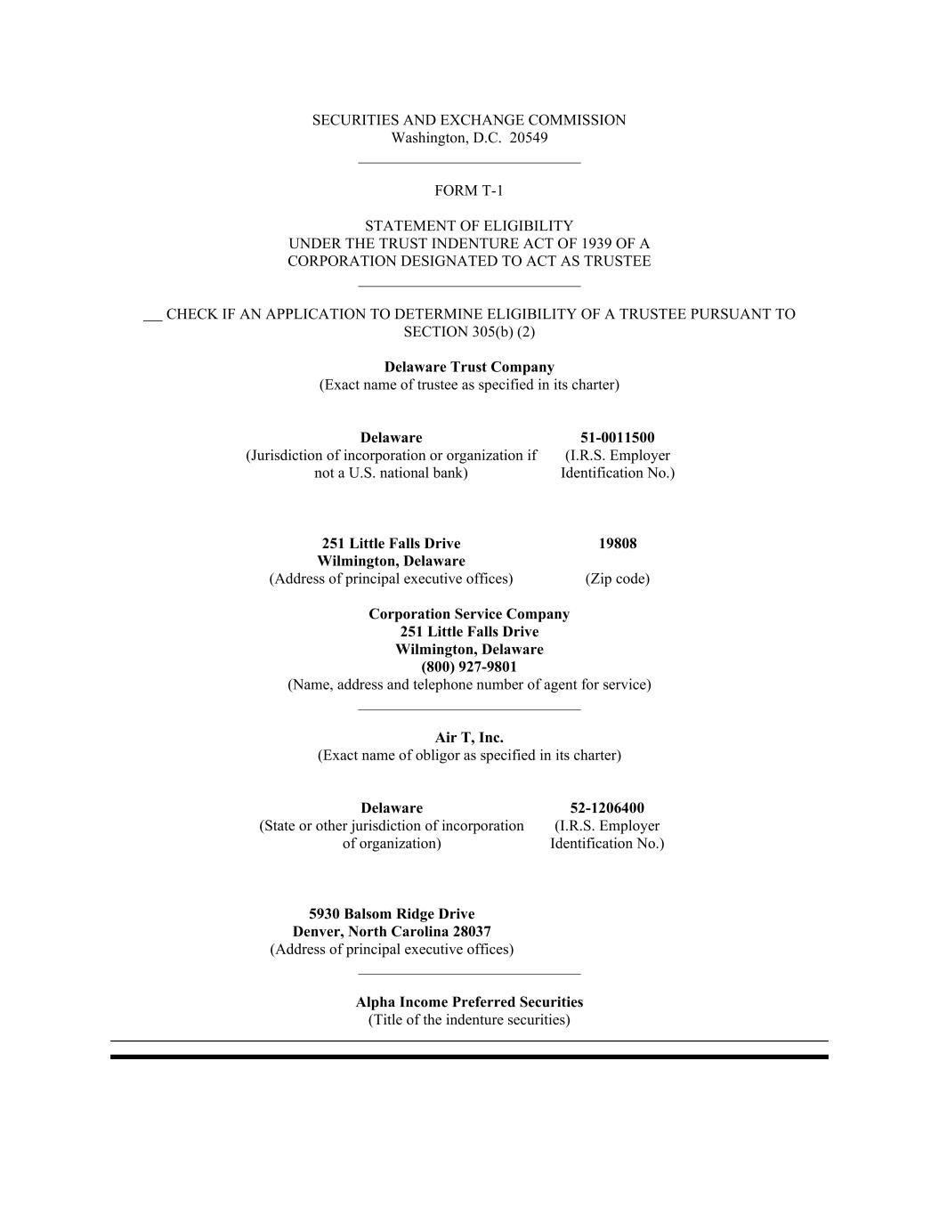 We are offering to issue shares of Air T Funding Alpha Income Trust Preferred Securities (also referred to as the 8.0% Cumulative Securities or “Trust Preferred Securities”), par value $25.00 per share (the securities being issued in the Exchange Offer being referred to as the “Trust Preferred Securities”) in exchange for shares of our Common Stock, par value, $1.00 per share (the “Shares”) validly tendered prior to, and not withdrawn before, the Expiration Date. See “Description of Air T’s Capital Stock”, “Description of Trust Preferred Securities, Junior Subordinated Debentures and Guarantee” and “Exchange Offer.” In exchange for each Share validly tendered, a holder of a Share will receive 1.40 Trust Preferred Securities, upon the terms and subject to the conditions set forth in this Exchange Offer and the related Letter of Transmittal (collectively, as they may be amended or supplemented from time to time, the “Exchange Offer”).
