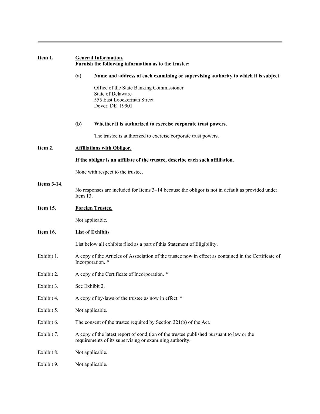 (j) The undersigned registrant hereby undertakes to file an application for the purpose of determining the eligibility of the trustee to act under subsection (a) of Section 310 of the Trust Indenture Act in accordance with the rules and regulations prescribed by the Commission under Section 305(b)(2) of the Trust Indenture Act.