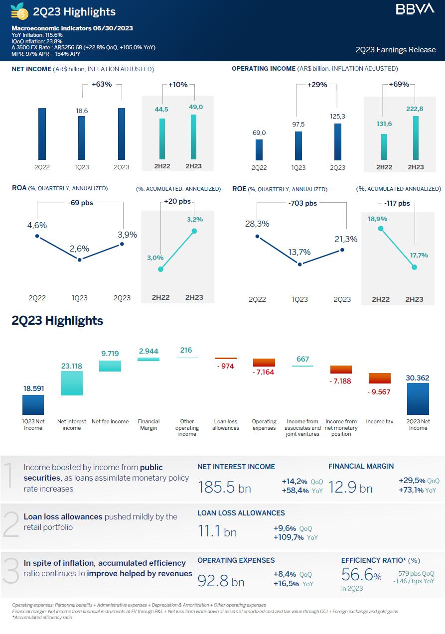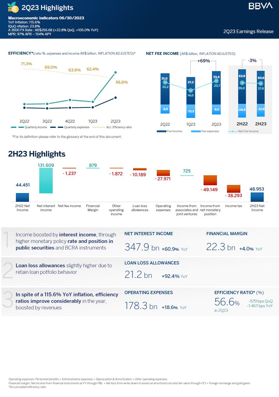 | · | BBVA Argentina’s inflation adjusted net income in 2Q23 was $30.4 billion, 63.3% greater than the $18.6 billion reported on the first quarter of 2023 (1Q23), and 11.4% lower than the $34.3 billion reported on the second quarter of 2022 (2Q22). BBVA Argentina’s inflation adjusted net income for the first half of 2023 (2H23) totaled $49.0 billion, 10.1% higher than the $44.5 billion reported in the first half of 2022 (2H22). |