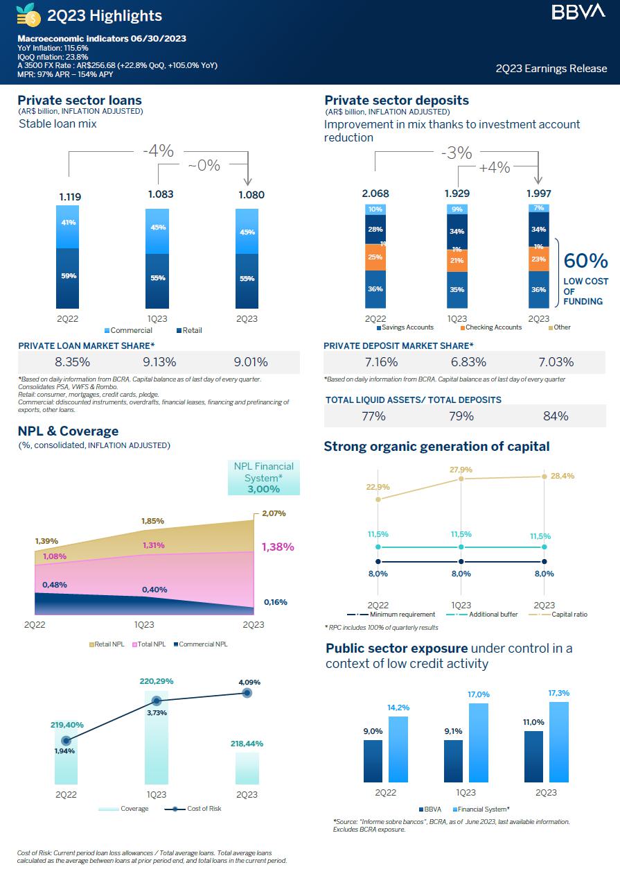Buenos Aires, August 23, 2023 – Banco BBVA Argentina S.A (NYSE; BYMA; MAE: BBAR; LATIBEX: XBBAR) (“BBVA Argentina” or “BBVA” or “the Bank”) announced today its consolidated results for the second quarter (2Q23), ended on June 30, 2023.