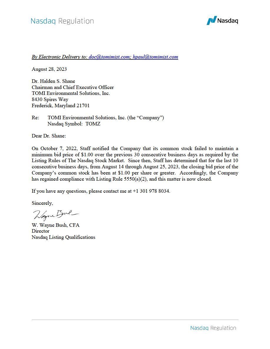 On August 28, 2023, TOMI Environmental Solution, Inc. (the “Company”) received a letter from the Listing Qualifications Department of the Nasdaq Stock Market (“NASDAQ”) confirming that the Company has regained compliance with NASDAQ’s minimum bid price continuing listing requirement as set forth in Listing Rule 5550(a)(2) and that the matter was now closed.