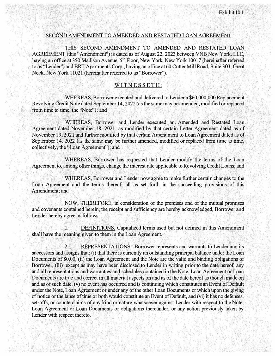 SECOND AMENDMENT TO AMENDED AND RESTATED LOAN AGREEMENT THIS SECOND AMENDMENT TO AMENDED AND RESTATED LOAN AGREEMENT (this "Amendment") is dated as of August 22, 2023 between VNB New York, LLC, having an office at 350 Madison Avenue, 5th Floor, New York, New York 10017 (hereinafter referred to as "Lender") and BRT Apartments Corp., having an office at 60 Cutter Mill Road, Suite 303, Great Neck, New York 11021 (hereinafter referred to as "Borrower"). WI TNES SETH: WHEREAS, Borrower executed and delivered to Lender a $60,000,000 Replacement Revolving Credit Note dated September 14, 2022 (as the same may be amended, modified or replaced from time to time, the "Note"); and WHEREAS, Borrower and Lender executed an. Amended and Restated Loan Agreement dated November 18, 2021, as modified by that certain Letter Agreement dated as of November 19, 2021 and further modified by that certain Amendment to Loan Agreement dated as of September 14, 2022 (as the same may be further amended, modified or replaced from time to time, collectively, the "Loan Agreement"); and WHEREAS, Borrower has requested that Lender modify the terms of the Loan Agreement to, among other things, change the interest rate applicable to Revolving Credit Loans; and WHEREAS, Borrower and Lender now agree to make further certain changes to the Loan Agreement and the terms thereof, all as set forth in the succeeding provisions of this Amendment; and NOW, THEREFORE, in consideration of the premises and of the mutual promises and covenants contained herein, the receipt and sufficiency are hereby acknowledged, Borrower and Lender hereby agree as follows: 1. DEFINITIONS. Capitalized terms used but not defined in this Amendment shall have the meaning given to them in the Loan Agreement. 2. REPRESENTATIONS. Borrower represents and warrants to Lender and its successors and assigns that: (i) that there is currently an outstanding principal balance under the Loan Documents of$0.00, (ii) the Loan Agreement and the Note are the valid and binding obligations of Borrower, (iii) except as may have been disclosed to Lender in writing prior to the date hereof, any and all representations and warranties and schedules contained in the Note, Loan Agreement or Loan Documents are true and correct in all material aspects on and as of the date hereof as though made on and as of such date, (v) no event has occurred and is continuing which constitutes an Event of Default under the Note, Loan Agreement or under any of the other Loan Documents or which upon the giving of notice or the lapse of time or both would constitute an Event of Default, and (vi) it has no defenses, set-offs, or counterclaims of any kind or nature whatsoever against Lender with respect to the Note, Loan Agreement or Loan Documents or obligations thereunder, or any action previously taken by Lender with respect thereto. Exhibit 10.1