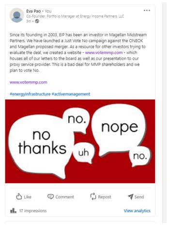 Since its founding in 2003, EIP has been an investor in Magellan Midstream Partners. We have launched a Just Vote No Campaign against the ONEOK and Magellan proposed merger. As a resource for other investors trying to evaluate the deal, we created a website – www.votemmp.com – which houses all of our letters to the board as well as our presentation to our proxy service provider. This is a bad deal for MMP shareholders and we plan to vote No.