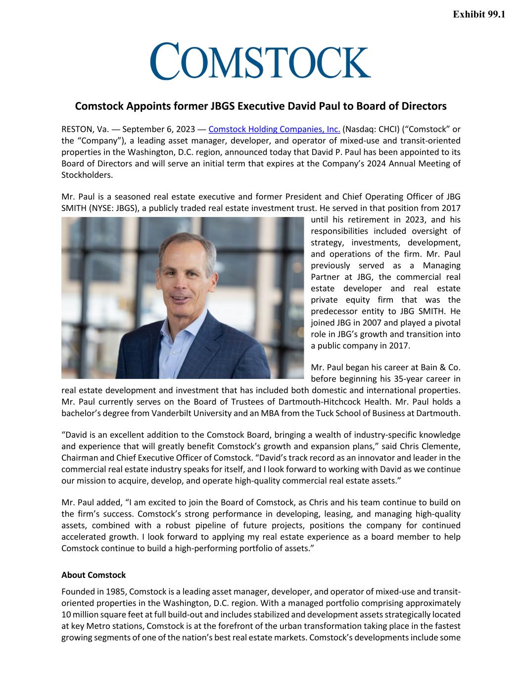 Comstock Appoints former JBGS Executive David Paul to Board of Directors RESTON, Va. — September 6, 2023 — Comstock Holding Companies, Inc. (Nasdaq: CHCI) (“Comstock” or the “Company”), a leading asset manager, developer, and operator of mixed-use and transit-oriented properties in the Washington, D.C. region, announced today that David P. Paul has been appointed to its Board of Directors and will serve an initial term that expires at the Company’s 2024 Annual Meeting of Stockholders. Mr. Paul is a seasoned real estate executive and former President and Chief Operating Officer of JBG SMITH (NYSE: JBGS), a publicly traded real estate investment trust. He served in that position from 2017 until his retirement in 2023, and his responsibilities included oversight of strategy, investments, development, and operations of the firm. Mr. Paul previously served as a Managing Partner at JBG, the commercial real estate developer and real estate private equity firm that was the predecessor entity to JBG SMITH. He joined JBG in 2007 and played a pivotal role in JBG’s growth and transition into a public company in 2017. Mr. Paul began his career at Bain & Co. before beginning his 35-year career in real estate development and investment that has included both domestic and international properties. Mr. Paul currently serves on the Board of Trustees of Dartmouth-Hitchcock Health. Mr. Paul holds a bachelor’s degree from Vanderbilt University and an MBA from the Tuck School of Business at Dartmouth. “David is an excellent addition to the Comstock Board, bringing a wealth of industry-specific knowledge and experience that will greatly benefit Comstock’s growth and expansion plans,” said Chris Clemente, Chairman and Chief Executive Officer of Comstock. “David’s track record as an innovator and leader in the commercial real estate industry speaks for itself, and I look forward to working with David as we continue our mission to acquire, develop, and operate high-quality commercial real estate assets.” Mr. Paul added, “I am excited to join the Board of Comstock, as Chris and his team continue to build on the firm’s success. Comstock’s strong performance in developing, leasing, and managing high-quality assets, combined with a robust pipeline of future projects, positions the company for continued accelerated growth. I look forward to applying my real estate experience as a board member to help Comstock continue to build a high-performing portfolio of assets.” About Comstock Founded in 1985, Comstock is a leading asset manager, developer, and operator of mixed-use and transit- oriented properties in the Washington, D.C. region. With a managed portfolio comprising approximately 10 million square feet at full build-out and includes stabilized and development assets strategically located at key Metro stations, Comstock is at the forefront of the urban transformation taking place in the fastest growing segments of one of the nation’s best real estate markets. Comstock’s developments include some Exhibit 99.1