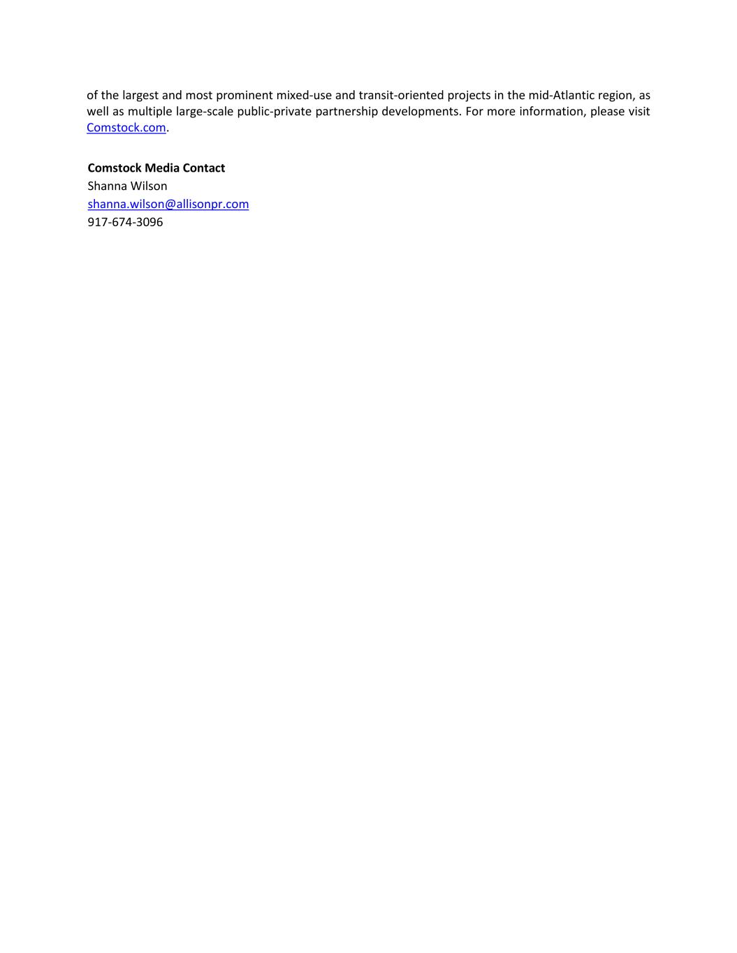 of the largest and most prominent mixed-use and transit-oriented projects in the mid-Atlantic region, as well as multiple large-scale public-private partnership developments. For more information, please visit Comstock.com. Comstock Media Contact Shanna Wilson shanna.wilson@allisonpr.com 917-674-3096