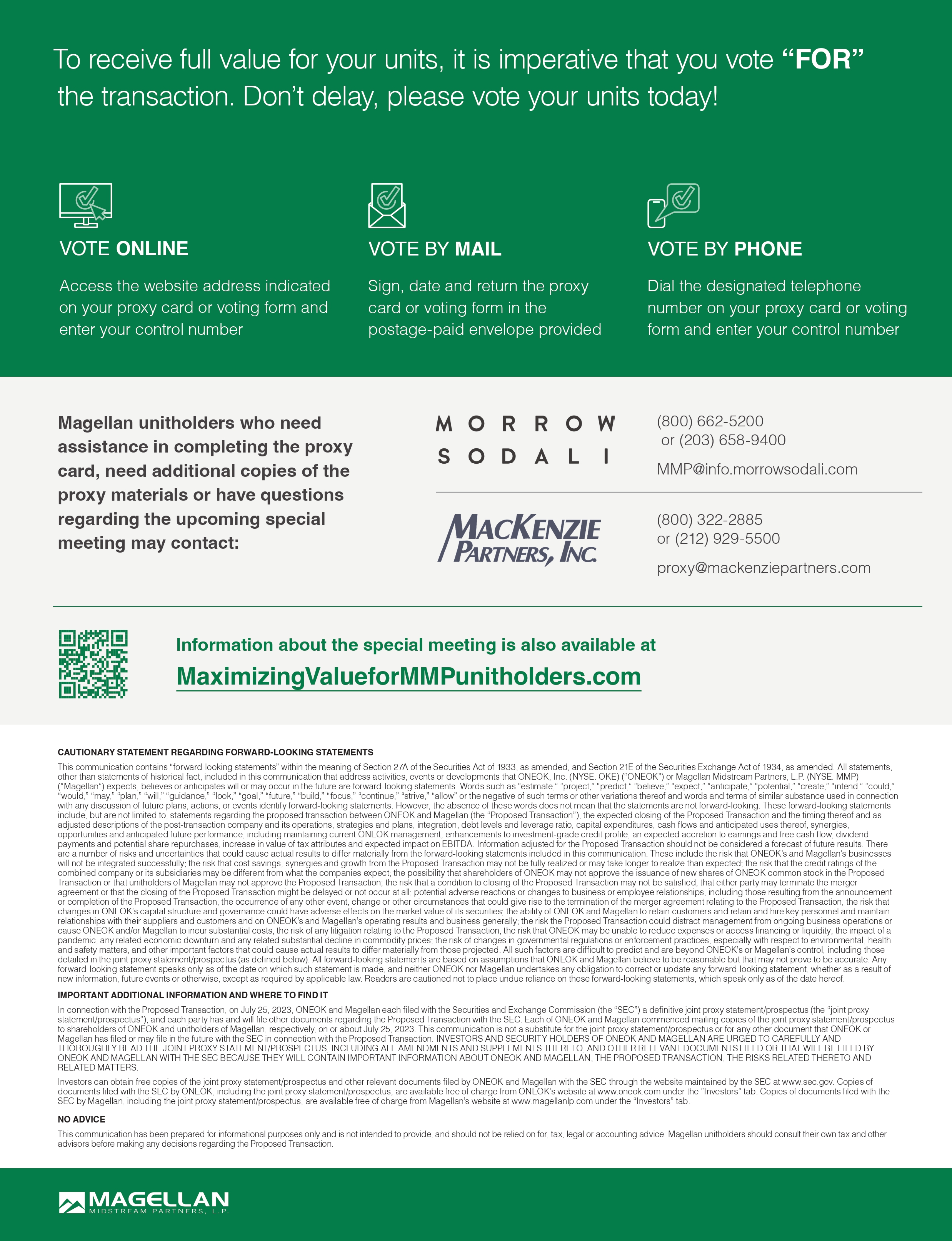 In connection with the Proposed Transaction, on July 25, 2023, ONEOK and Magellan each filed with the Securities and Exchange Commission (the “SEC”) a definitive joint proxy statement/prospectus (the “joint proxy statement/prospectus”), and each party has and will file other documents regarding the Proposed Transaction with the SEC. Each of ONEOK and Magellan commenced mailing copies of the joint proxy statement/prospectus to shareholders of ONEOK and unitholders of Magellan, respectively, on or about July 25, 2023. This communication is not a substitute for the joint proxy statement/prospectus or for any other document that ONEOK or Magellan has filed or may file in the future with the SEC in connection with the Proposed Transaction. INVESTORS AND SECURITY HOLDERS OF ONEOK AND MAGELLAN ARE URGED TO CAREFULLY AND THOROUGHLY READ THE JOINT PROXY STATEMENT/PROSPECTUS, INCLUDING ALL AMENDMENTS AND SUPPLEMENTS THERETO, AND OTHER RELEVANT DOCUMENTS FILED OR THAT WILL BE FILED BY ONEOK AND MAGELLAN WITH THE SEC BECAUSE THEY WILL CONTAIN IMPORTANT INFORMATION ABOUT ONEOK AND MAGELLAN, THE PROPOSED TRANSACTION, THE RISKS RELATED THERETO AND RELATED MATTERS.