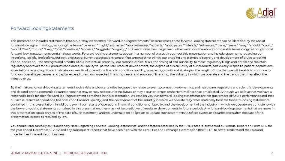 This presentation includes statements that are, or may be deemed, ‘‘forward - looking statements.’’ In some cases, these forward - l ooking statements can be identified by the use of forward - looking terminology, including the terms “believes,” “might,” estimates,” “approximately,” “expects,” “anticipates,” “in tends,” “estimates,” “plans,” “seeks,” “may,” “should,” “could,” “would,” “will”, “future,” “likely,” “goal,” “continue,” “appears,” “suggests,” “ongoing,” or, in each case, their negative o r o ther variations thereon or comparable terminology, although not all forward - looking statements contain these words. Forward looking statements appear in a number of places throughout this presenta tion and include statements regarding our intentions, beliefs, projections, outlook, analyses or current expectations concerning, among other things, our ongoing and pla nned discovery and development of drugs targeting alcohol addiction, , the strength and breadth of our intellectual property, our planned clinical trials, the timing of and our ability to make regulatory filings and obtain and maintain regulatory approvals for our product candidates, our ability to partner our product development, the degree of clinical util ity of our products, particularly in specific patient populations, expectations regarding clinical trial data, our results of operations, financial condition, liquidity, prospects, growth and st rategies, the length of time that we will be able to continue to fund our operating expenses and capital expenditures, our expected financing needs and sources of financing, the industry in wh ich we operate and the trends that may affect the industry or us. By their nature, forward - looking statements involve risks and uncertainties because they relate to events, competitive dynamics, and healthcare, regulatory and scientific developments and depend on the economic circumstances that may or may not occur in the future or may occur on longer or shorter timelines tha n anticipated. Although we believe that we have a reasonable basis for each forward - looking statement contained in this presentation, we caution you that forward - looking statemen ts are not guarantees of future performance and that our actual results of operations, financial condition and liquidity, and the development of the industry in which we operate may differ materially from the forward - looking statements contained in this presentation. In addition, even if our results of operations, financial condition and liquidity, and the de vel opment of the industry in which we operate are consistent with the forward - looking statements contained in this presentation, they may not be predictive of results or developments in future p eriods. Any forward - looking statements that we make in this presentation speak only as of the date of such statement, and we undertake no obligation to update such statements to re fle ct events or circumstances after the date of this presentation, except as required by law. You should read carefully our “Cautionary Note Regarding Forward - Looking Statements” and the factors described in the “Risk Fact ors” sections of our Annual Report on Form 10 - K for the year ended December 31, 2022 and any subsequent reports that have been filed with the Securities and Exchange Commission (th e “SEC”) to better understand the risks and uncertainties inherent in our business. . 2 ADIAL PHARMACEUTICALS INC. | MEDICINES FOR ADDICTION Forward Looking Statements