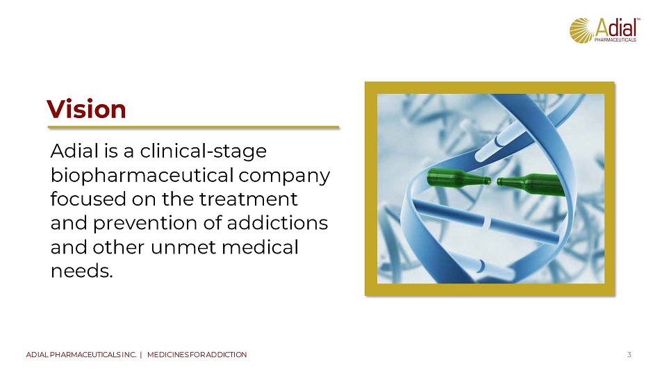 Adial is a clinical - stage biopharmaceutical company focused on the treatment and prevention of addictions and other unmet medical needs. V ision 3 ADIAL PHARMACEUTICALS INC. | MEDICINES FOR ADDICTION