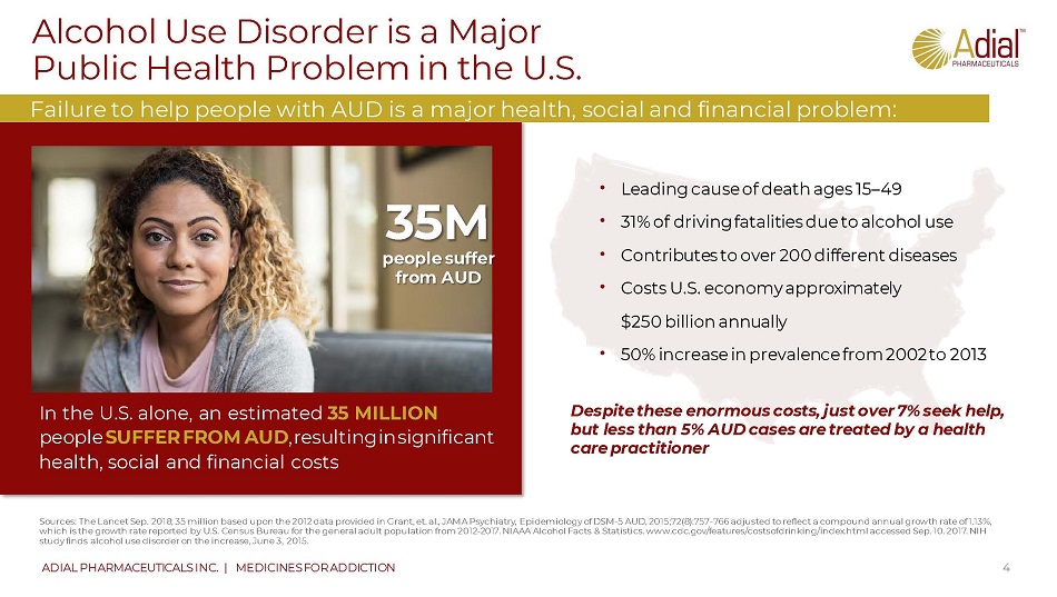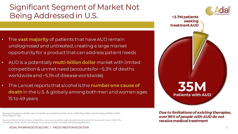 Alcohol Use Disorder is a Major Public Health Problem in the U.S. 4 ADIAL PHARMACEUTICALS INC. | MEDICINES FOR ADDICTION In the U.S. alone, an estimated 35 MILLION people SUFFER FROM AUD , resulting in significant health, social and financial costs • Leading cause of death ages 15 – 49 • 31% of driving fatalities due to alcohol use • Contributes to over 200 different diseases • Costs U.S. economy approximately $250 billion annually • 50% increase in prevalence from 2002 to 2013 Despite these enormous costs, just over 7% seek help, but less than 5% AUD cases are treated by a health care practitioner 3 5M people suffer from AUD Sources: The Lancet Sep. 2018; 35 million based upon the 2012 data provided in Grant, et. al., JAMA Psychiatry, Epidemiology of DSM - 5 AUD, 2015;72(8):757 - 766 adjusted to reflect a compound annual growth rate of 1.13%, which is the growth rate reported by U.S. Census Bureau for the general adult population from 2012 - 2017. NIAAA Alcohol Facts & Statistics. www.cdc.gov/features/costsofdrinking/index.html accessed Sep. 10. 2017. NIH study finds alcohol use disorder on the increase, June 3, 2015. Failure to help people with AUD is a major health, social and financial problem: