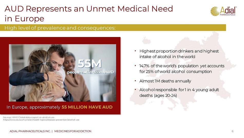 Significant Segment of Market Not Being Addressed in U.S. 5 ADIAL PHARMACEUTICALS INC. | MEDICINES FOR ADDICTION Due to limitations of existing therapies, over 95% of people with AUD do not receive medical treatment • The vast majority of patients that have AUD remain undiagnosed and untreated , creating a large market opportunity for a product that can address patient needs • AUD is a potentially multi - billion dollar market with limited competition & unmet need (accounts for ~5.3% of deaths worldwide and ~5.1% of disease worldwide) • The Lancet reports that alcohol is the number one cause of death in the U.S. & globally among both men and women ages 15 to 49 years Sources: Prevalence of AUD over 12 - months as reported by Grant, et. al., JAMA Psychiatry, Epidemiology of DSM - 5 AUD, 2015;72(8):757 - 766. 3 5M Patients with AUD Sources: NIAAA Alcohol Facts & Statistics. www.cdc.gov/features/costsofdrinking/index.html accessed June 3, 2020. The Lancet Sep. 2018., WHO Fact Sheets www.who.int/news - room/fact - sheets/detail/alcohol ~2.7M patients seeking treatment AUD