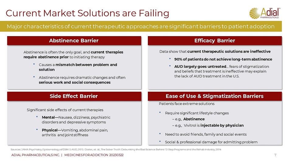 AUD Represents an Unmet Medical N eed in Europe 6 ADIAL PHARMACEUTICALS INC. | MEDICINES FOR ADDICTION In Europe, approximately 55 MILLION HAVE AUD • Highest proportion drinkers and highest intake of alcohol in the world • 14.7% of the world’s population yet accounts for 25% of world alcohol consumption • Almost 1M deaths annually • Alcohol responsible for 1 in 4 young adult deaths (ages 20 - 24) Sources: WHO Global status report on alcohol use - https://www.euro.who.int/en/health - topics/disease - prevention/alcohol - use 5 5M people suffer from AUD 5 5M people suffer from AUD High level of prevalence and consequences: